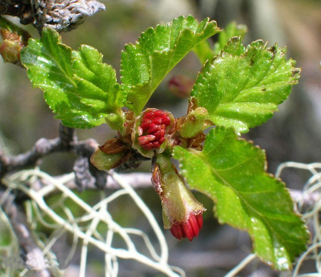 En noviembre comienza la apertura de sus brotes, cuando las condiciones climáticas permiten el descongelamiento del suelo, y junto a las primeras hojas aparecen las flores masculinas solitarias (0,4 cm) en la base de los brotes y más tarde las flores femeninas dispuestas en grupos de tres (0,3 cm) en los extremos de los brotes. Estas flores son polinizadas por acción del viento, y los frutos se forman rápidamente a principios del verano. Éstos están formados por tres semillas (0,3-0,5 cm) cubiertas por una cúpula, de las cuales dos son semillas tri-aladas y una central bi-alada, siendo dispersadas por el viento entre Marzo y Mayo.