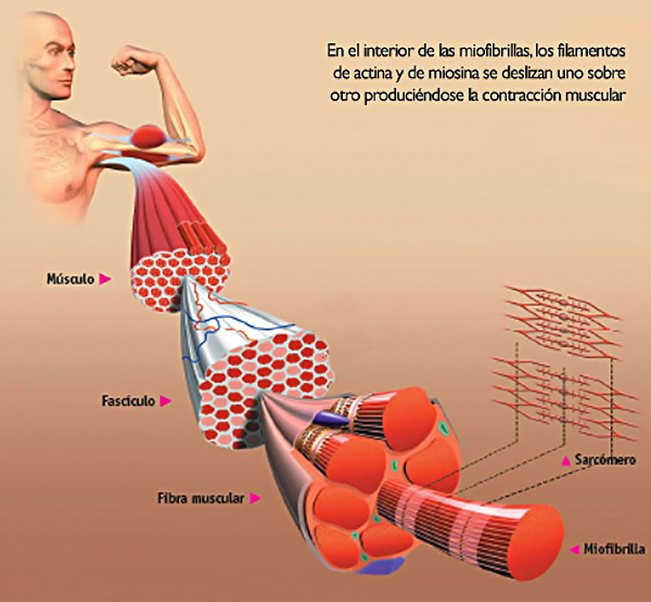 En la medida que la contracción se lleva a cabo, cada sarcómero – paquete de miofibrillas encerrado por el sarcolema – se va acortando. Y ya que todos los sarcómeros se contraen al mismo tiempo el resultado es la contracción del músculo.