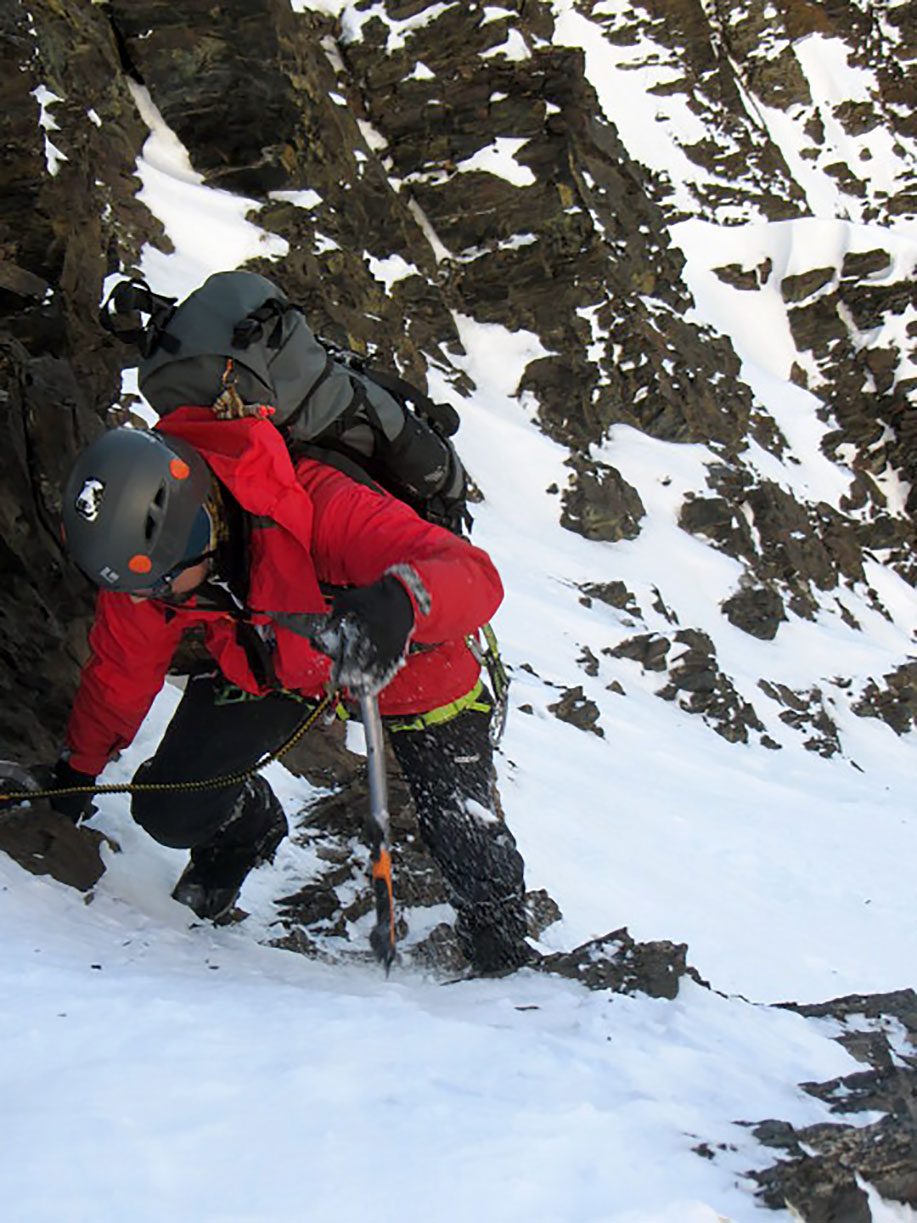 Ya a esa altura estábamos muy mojados y Daniel tenía seriamente comprometidos los dedos de sus manos, yo me encontraba con la planta y punta delantera de los pies súper debilitados de cramponear sobre el hielo abriendo la ruta. Cuando alcanzamos la zona que bifurca la el filo este con la canaleta de la ruta del Padre Franciscano María De Agostini, estuve media hora buscando los anclajes para asegurar esa parte, que tiene un balcón con caída a una canaleta de 80 grados de inclinación, ruta que conozco porque la escale como cordada en septiembre del 2016 con el gran escalador y guía de montaña Felipe Randis.