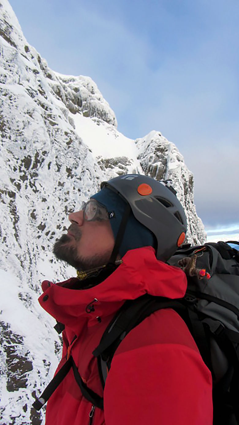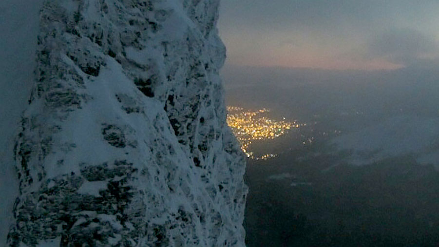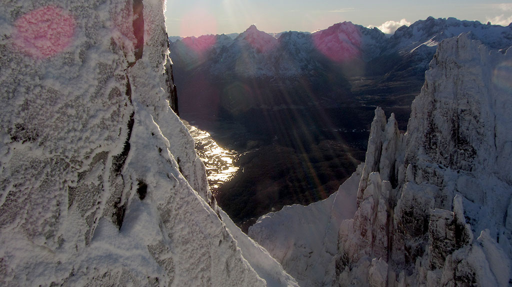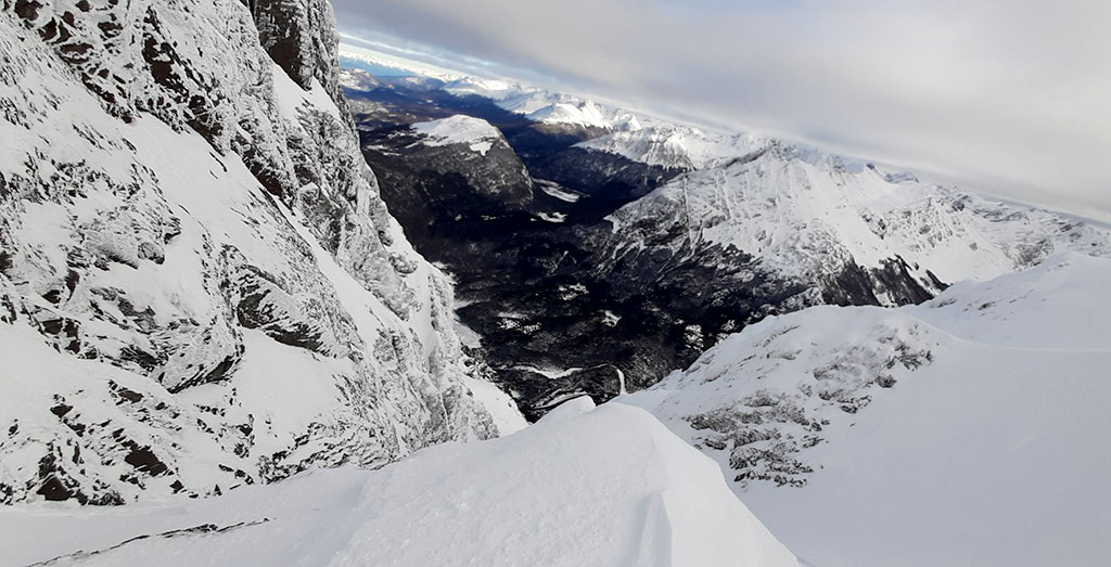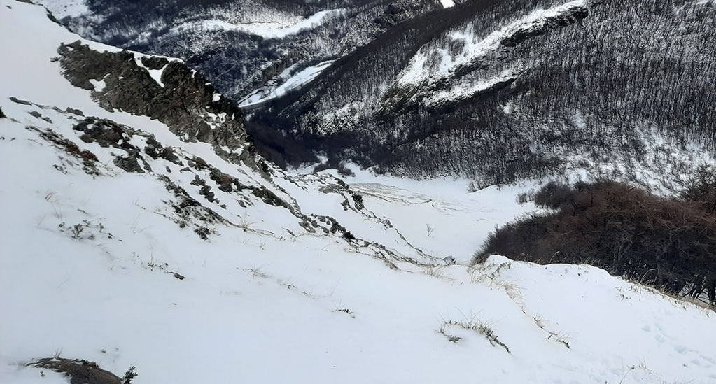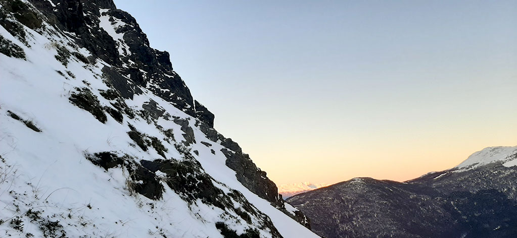 “Al principio de la desescalada, estaba ciego por el hielo en cejas y pestañas. Con las manos congeladas y con la rodilla que quería resentirse. Luego cuando íbamos en mitad, el agotamiento empezaba a asomar. La noche cada vez más cerca. Que más se podía hacer que no fuera seguir bajando? No quedaba de otra, agachar la cabeza y seguir bajando a la seguridad del bosque y al confort de un mate cocido azucarado que llevaba ya tibio dentro del termo en mi mochila cubierta de hielo”
