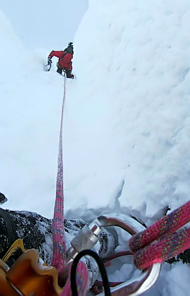 “En dos ocasiones tuve que darle seguro a Pablo mientras él iba camino al siguiente anclaje, las dos ocasiones, luego de armar los sistemas me quede ahí, anclado con mis manos en la cuerda viendo como el compañero se perdía tras una esquina o subida. Preparado para lo peor, ese momento en que se tensa de repente la cuerda y se siente la sacudida, el seguro actuando y esperar frenar una caída. Ahí estaba, inmóvil, expuesto a los elementos y con el hielo ya formándose dentro del guante esperando lo peor y deseando que la cuerda se afloje y el compañero empiece a recoger cuerda desde el otro extremo. VENITE! - VOY!”