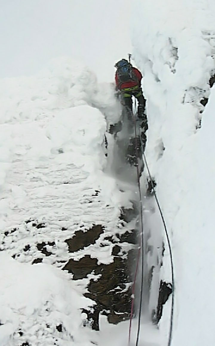 Cuando empezamos a transitar en ensamble la canaleta observamos que al medio de la misma había una zanja de un metro de profundidad y debajo de la misma una placa de hielo, esta zanja se prologaba hasta el primer rapel antes de la zona del embudo. Esta situación nos confirmaba que en los últimos días y a causa de los temporales recientes había habido avalanchas en la zona, lo que nos ponía en alerta. Ante lecturas que íbamos haciendo en el transcurso del ascenso trazábamos variantes a la ruta, esquivando estas zonas de peligro, por ello escalábamos los resaltes de roca por fuera de la canaleta, lo que nos llevaba más tiempo y más complicación técnica para sortear los pasos.