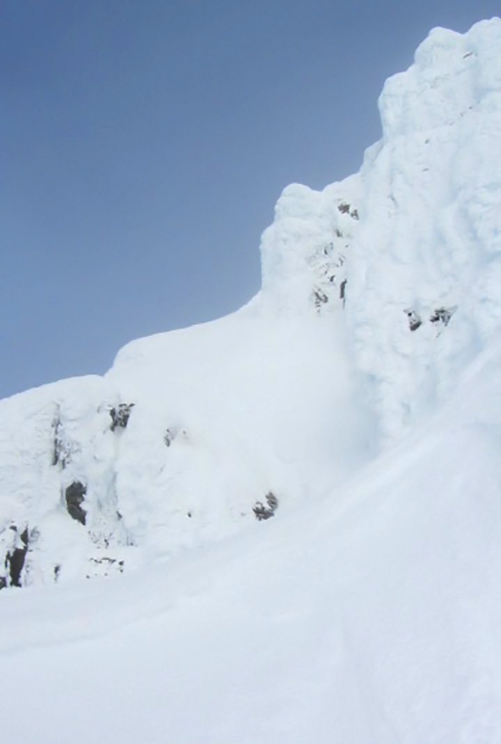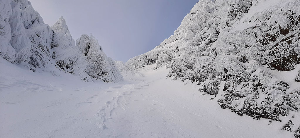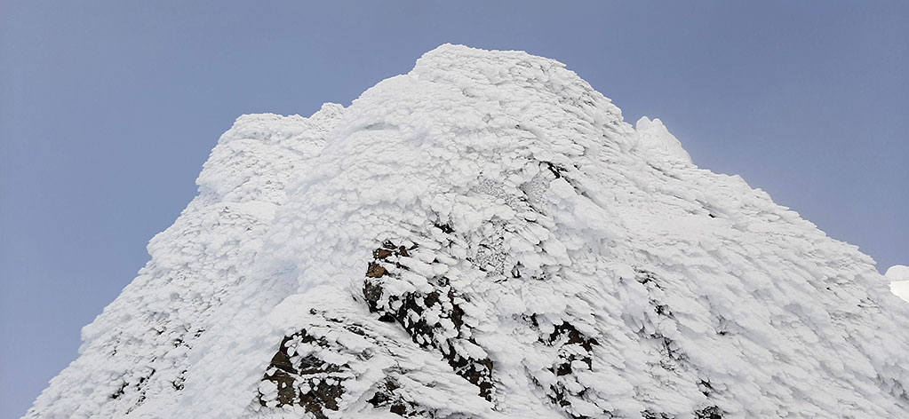 Cuando empezamos a ascender, ya la aproximación empezó a demostrar bastante acumulación nívea. Cuando llegamos al límite del bosque, en la ladera sur del cerro había muchísima nieve; este tramo que por lo general se hace en 1 hora en estas condiciones nos costó 2 horas, haciendo pasos y liberando nieve con la pala de la piqueta. Con estas condiciones era imposible mantener la línea de la ruta, teníamos que improvisar escaladas en los resaltes de roca que en oportunidades se nos presentaba en forma de balcones, donde teníamos que escalar con una piqueta y una mano para poder elevarnos. Así de tortuoso fue hasta llegar a la canaleta central, de donde sale al filo del famoso conejito (Torre Norte del Macizo Olivia, formadas de roca y cubiertas de hielo que tiene un parecido a las orejas de un conejo). Allí la imagen eran de Torres de hielo cristal, blanco y brillante, tan bello como imponente.