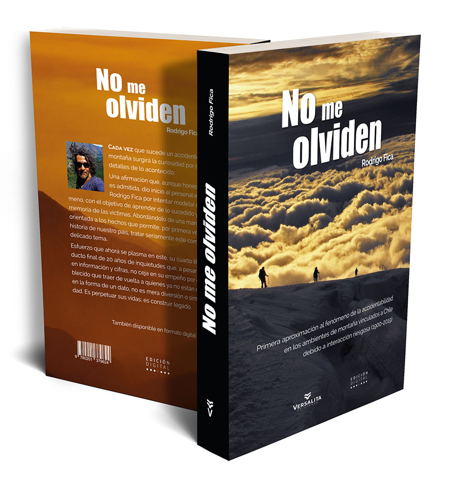 "No me olviden" es el cuarto libro de Rodrigo Fica. Publicado por Editorial Versalita, está organizado en cuatro partes (conceptos, datos, estadísticas y reflexiones), en él se aborda el fenómeno de la accidentabilidad en los ambientes de montaña de Chile entre los años 1900 y 2019, conteniendo en sus aproximadamente 480 páginas, 41 tablas, 42 gráficos, 10 esquemas y 438 fichas detallando todos los incidentes mortales sucedidos por la práctica de actividades como el montañismo, excursionismo, esquí, trail running, militares, turismo, desplazamiento, policiales y afines.