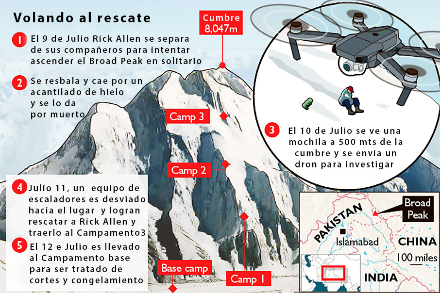 El lunes pasado el alpinista Rick Allen fue rescatado exitosamente, después de ser presuntamente muerto, en el Broad Peak en Pakistán, con la ayuda de un drone.