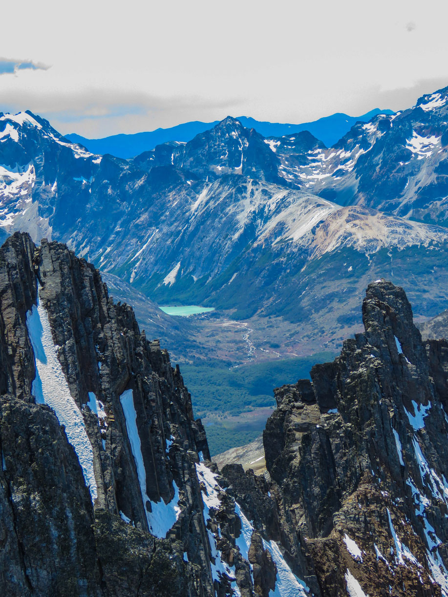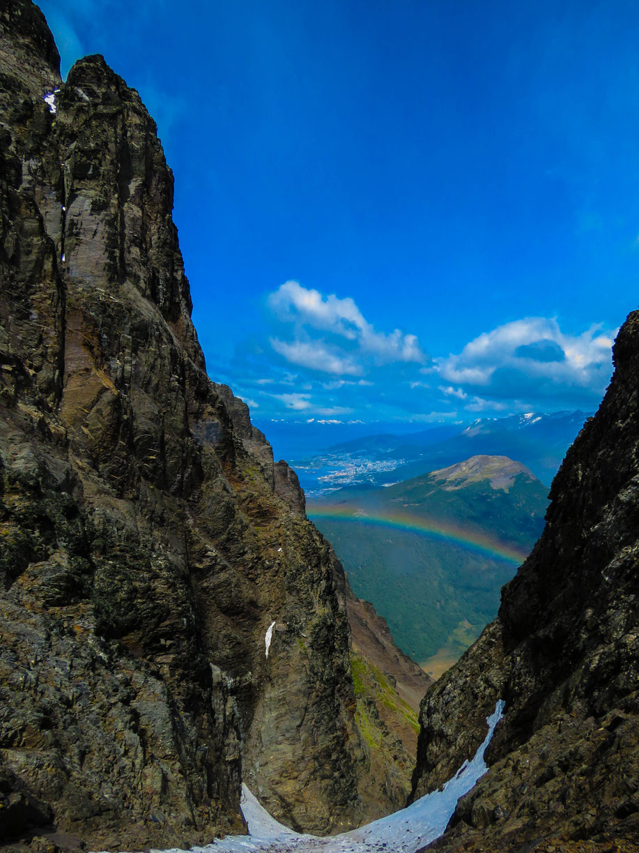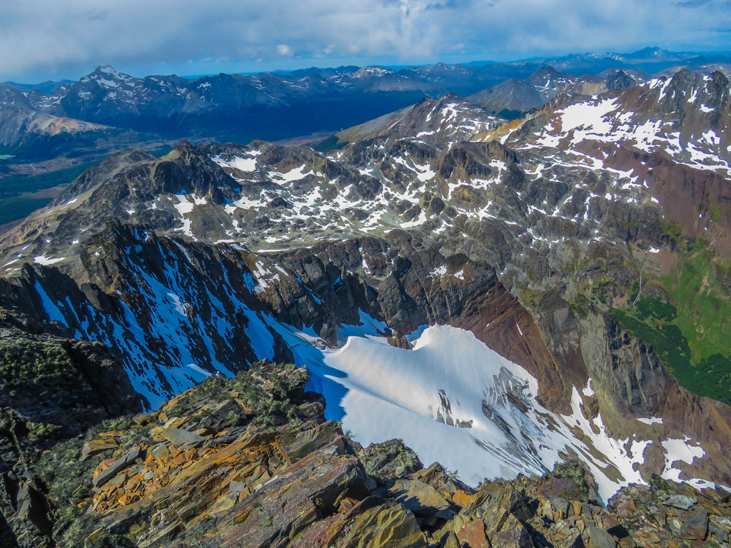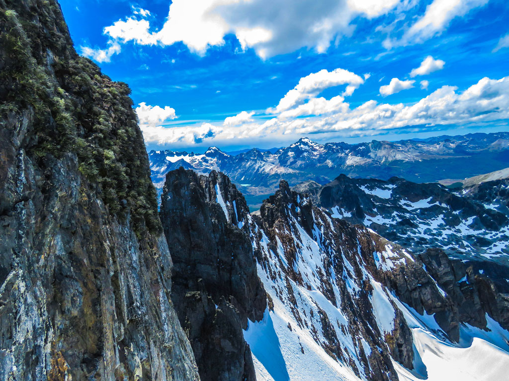 Una vez alcanzado esa zona, llegamos a un balcón, en donde ya se divisaba el otro lado de la montaña y, desde donde podían verse las otras montañas, entre ellas el cerro 5 Hermanos, también él Le Cloche, etc.
