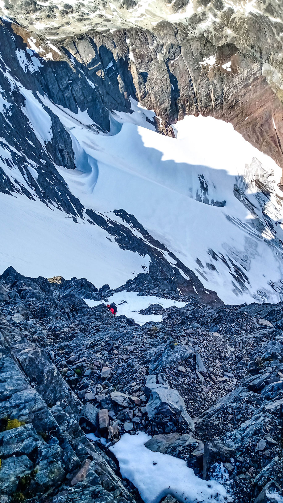 El descenso fue algo complejo, sabíamos que nos esperaban varias horas para bajar. Todo fue muy técnico, usando los empotradores, los prusik, y medimos cada paso. El buen manejo de la placa fue fundamental para descender con total seguridad. Tuvimos al principio que rapelear con una cuerda y utilizando otra de backup, la cual, una vez que bajamos ese primer trecho, la cuerda se trabo y mi compañero tuvo que subir hasta la cumbre nuevamente a destrabarla.