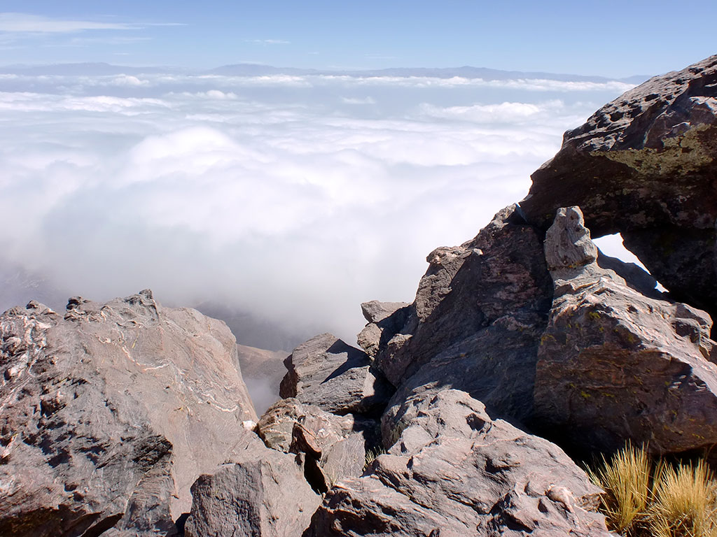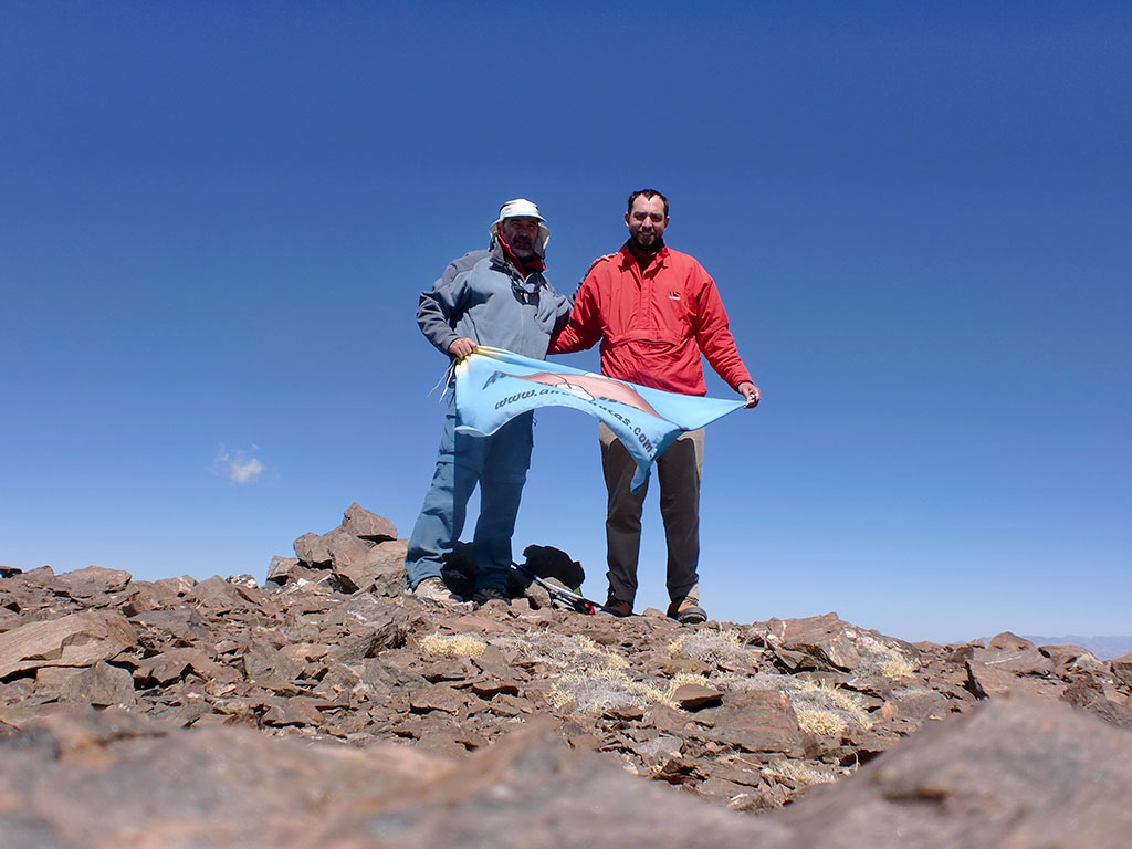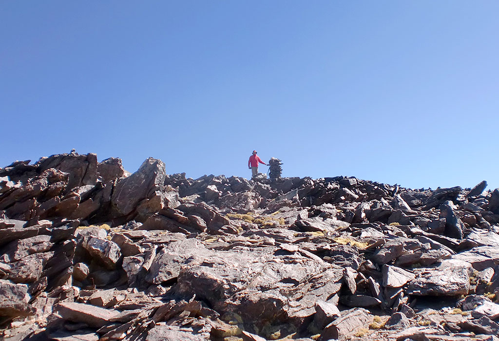 Como nos sentíamos bien decidimos bajar, faldear el filo que habíamos seguido y encarar la subida final, corta y sencilla para llegar finalmente al Alto de la Mina (S26° 36.892' W65° 43.269') que con sus 4.770 metros es el punto más alto de toda la cadena.