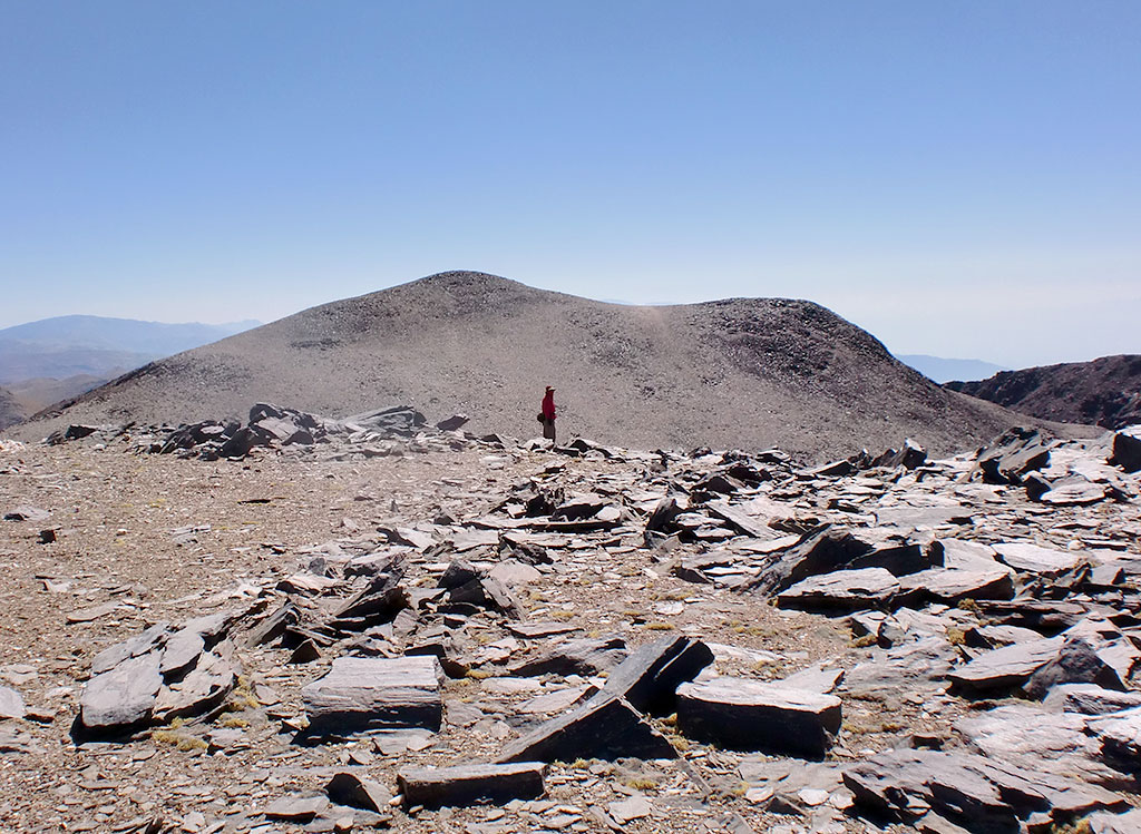 Del otro lado veíamos una cumbre que supusimos erróneamente que era la principal del Alto de la Mina. Bajamos y volvimos a subir para llegar a una pirca bastante chica. Ahí nos dimos cuenta de nuestro error y que nos habíamos pasado de largo y subido el Alto de la Mina Norte (S26° 36.348' W65° 43.398') de 4.730 metros. Desde ahí pudimos ver hacia el Sur la cumbre a la que habíamos querido ir.