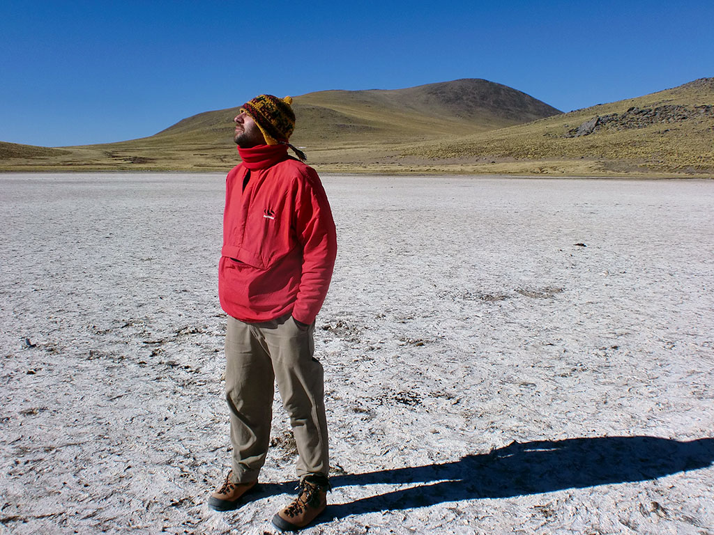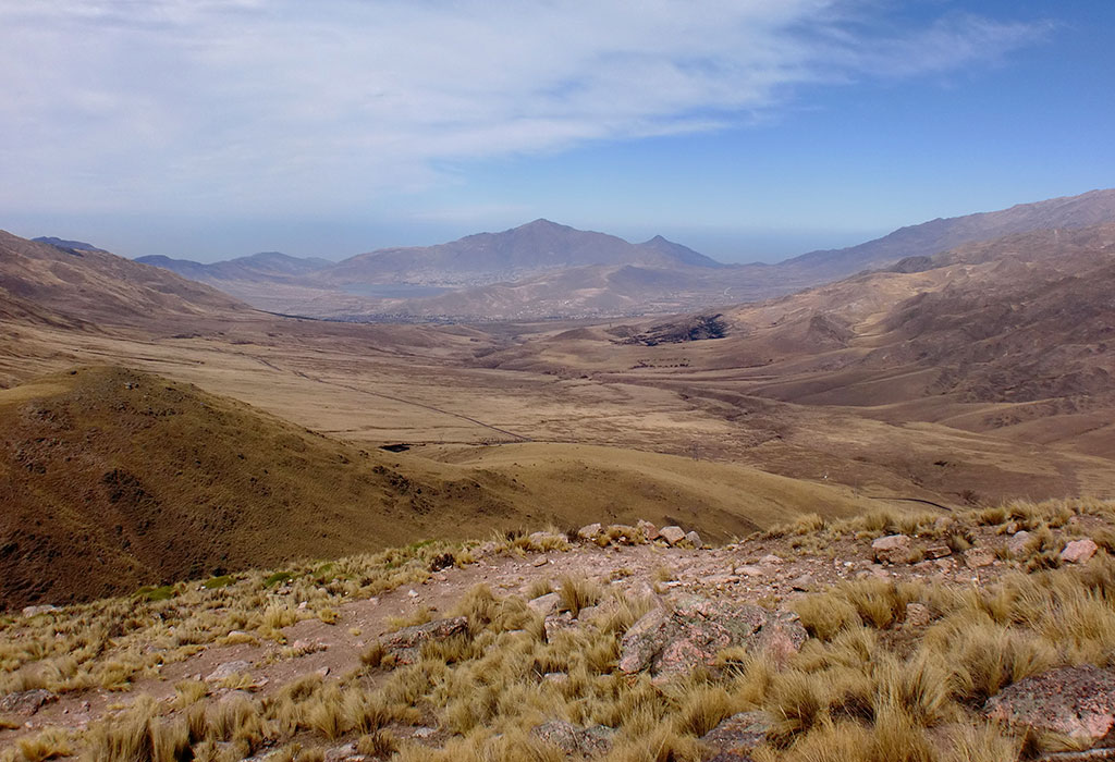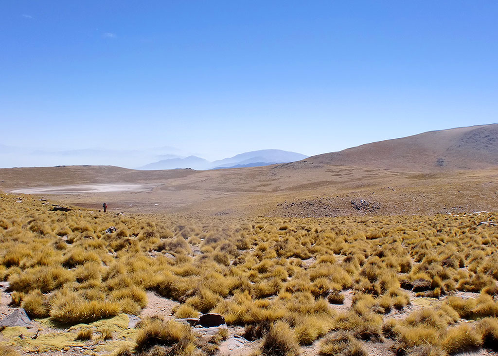 Una caminata larga con un declive suave pero que nunca nos terminaba de mostrar que había del otro lado. Siempre siguiendo por la izquierda, pasamos el final de la vega (S26° 37.817' W65° 45.333') nos encontramos una apacheta que nos indicó que íbamos por buen camino (S26° 37.141' W65° 45.490') y decidimos flanquear por la izquierda de un morro pasando por un lugar donde había como unos 10 cóndores volando para finalmente llegar a un filo desde el cuál pudimos ver a lo lejos la laguna, totalmente seca.