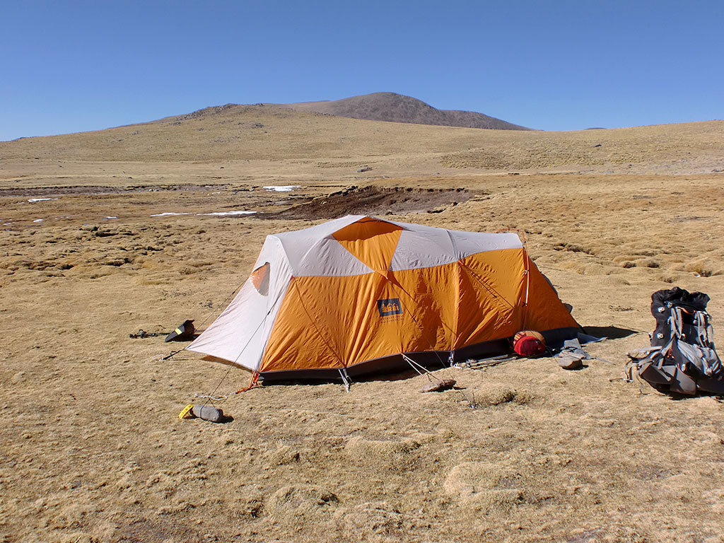 Dejamos la laguna atrás y encontramos de nuevo una huella de vehículo que seguimos un rato, hasta desviarnos a la derecha y encarar el manchón de nieve que se veía muy claro. Bajamos un poco por un terreno algo quebrado y llegamos finalmente a la quebrada del Matadero donde por suerte había agua abundante. El terreno ya no tan bueno para acampar, pero de algún modo encontramos dos lugares para poder montar las carpas (S26° 38.549' W65° 44.472') En este campamento estábamos a unos 4.320 metros de altura, por lo que las noches fueron haciéndose más frías todavía.