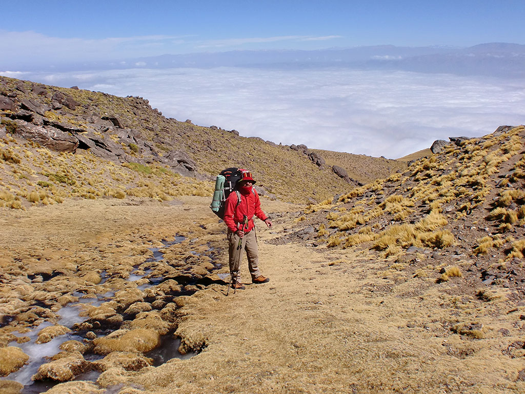 A partir de ahí empieza un descenso muy pronunciado y con unas vistas espectaculares, con nubes tapando el valle abajo nuestro. Por un muy buen rato pudimos seguir una senda bien marcada con apachetas hasta que unos 300 metros sobre el final de la pendiente perdimos la referencia y terminamos bajando como pudimos en medio de los espinillos. Duro, pero finalmente llegamos a un terreno de una pendiente mucho más amable y lleno de cardones. Lo fuimos transitando atravesando hondonadas, incluyendo una con agua, buscando la alameda que se veía más adelante.