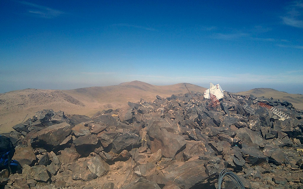 El ascenso fue sin complicaciones, tal como se veía desde el Campamento. Cruzó la laguna sin perder demasiada altura pasando por la izquierda de una lomada y de ahí subió por una rampa muy clara que llega prácticamente hasta la cumbre donde hay una antena y una construcción bastante grande rodeada de una enorme pirca, que le sirvió de refugio porque había bastante viento en la cumbre. En menos de 3 horas estaba de vuelta en la carpa.