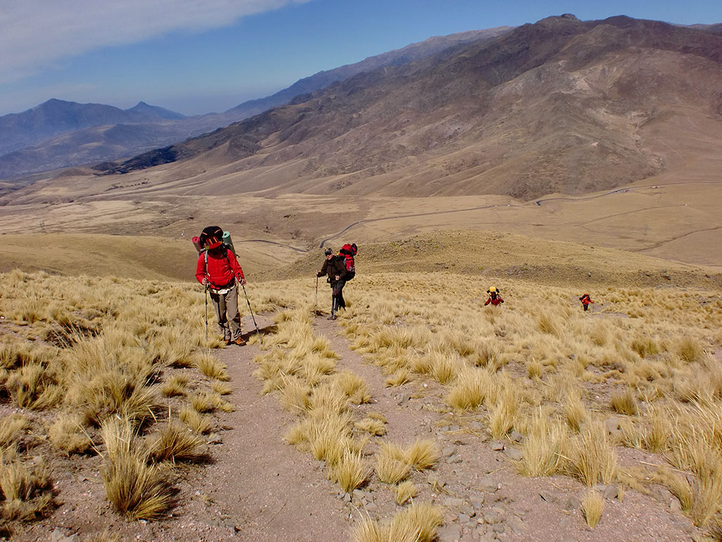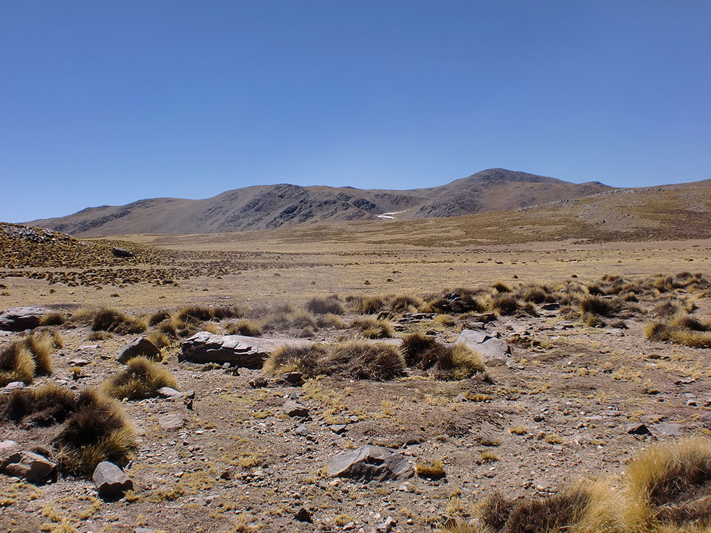 Los demás desmontamos el campamento y arrancamos, repitiendo parte de la ruta que ya habíamos hecho hasta la apacheta. Ahí nos desviamos a la izquierda siguiendo una senda, ya no tan marcada, hacia un filo por una pendiente tranquila. Al llegar se abrió adelante la enorme planicie de Huaca Huasi, al fondo de la cual está la quebrada del Matadero.