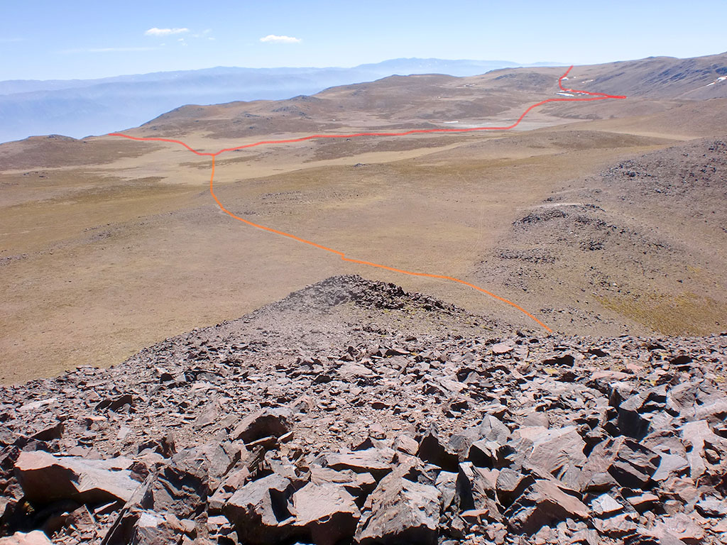 Nuestra idea era ir desde ahí hasta el Alto de la Mina, para lo que teníamos que bajar a un collado (S26° 37.179' W65° 43.706') a unos 4.690 metros y de ahí seguir el filo que lleva al punto más alto delas cumbres Calchaquíes. Bajamos, subimos el filo pero no nos dimos cuenta que este nos impedía ver la cumbre a la que queríamos ir. Por lo que nos pasamos de largo y nos encontramos con un 2° collado (S26° 36.577' W65° 43.520') a unos 4.650 metros, que no teníamos previsto.