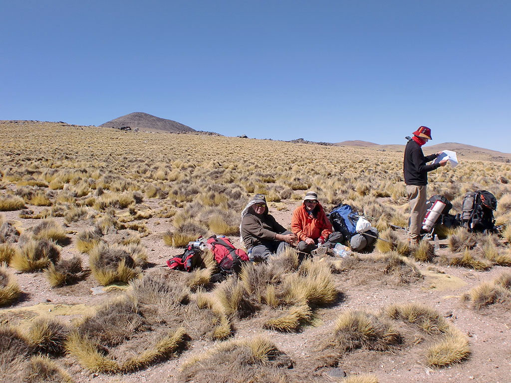 Al 3er día arrancamos a eso de las 9.30. Todos con algún efecto de la altura, pero Florencia empezó a sentirse peor que el resto. Seguimos para arriba por la quebrada en la que estábamos y al poco rato volvimos a encontrar la huella de vehículos que veníamos siguiendo. A la hora y media de haber salido, encontramos la zona conocida como Peña Grande, a unos 4.100 metros. Es la parte media de la vega que sigue más hacia arriba, pero mejor lugar para acampar (S26° 41.352' W65° 45.380')