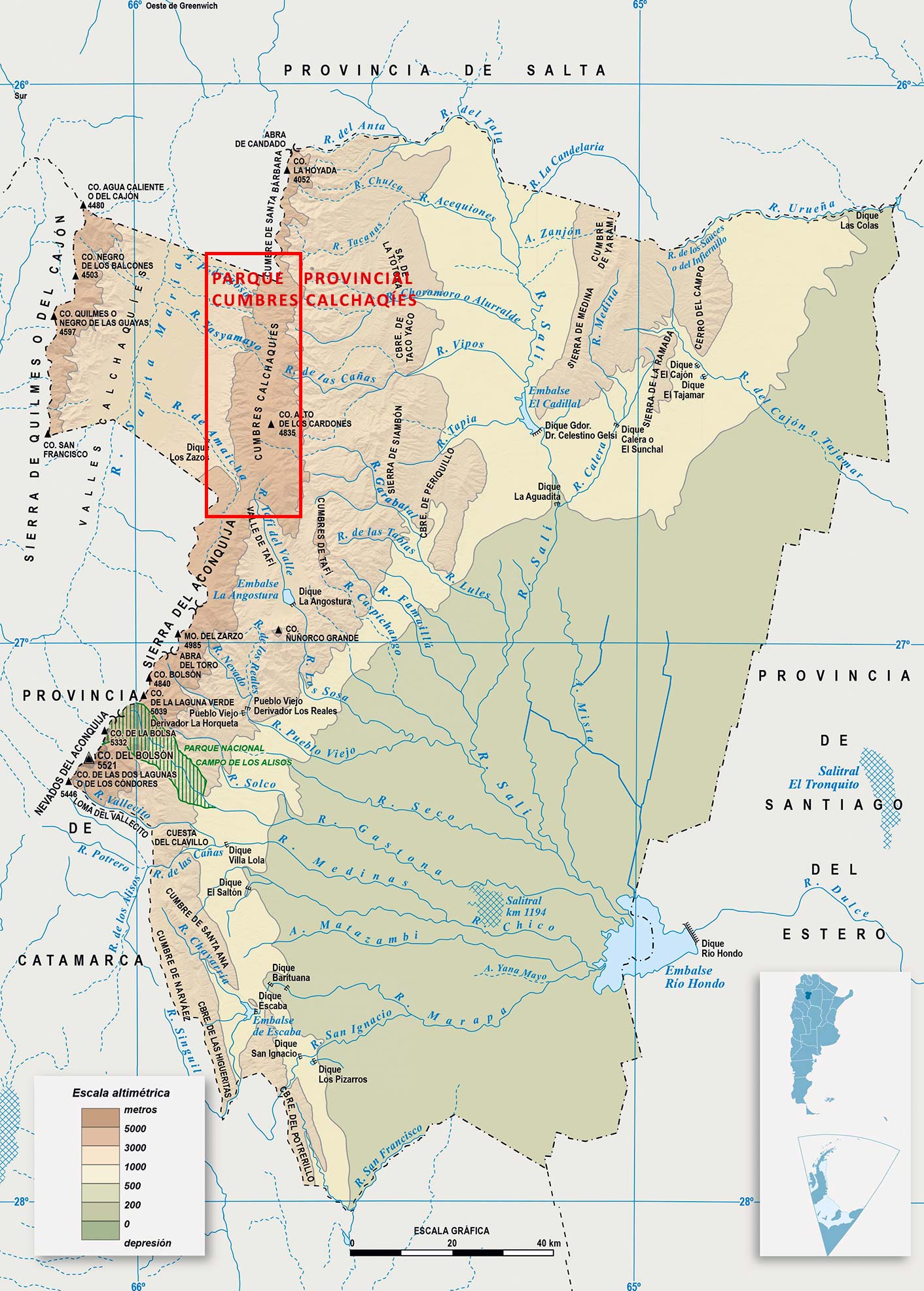 Según el libro Áreas protegidas de Tucumán su punto más alto es la cumbre del cerro Santa Isabel (4.740 mts.) pero otras fuentes de los clubes andinos de la zona coinciden en que el cerro más alto es el Cerro Alto de la Mina (4.762 mts.)