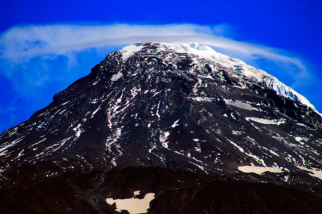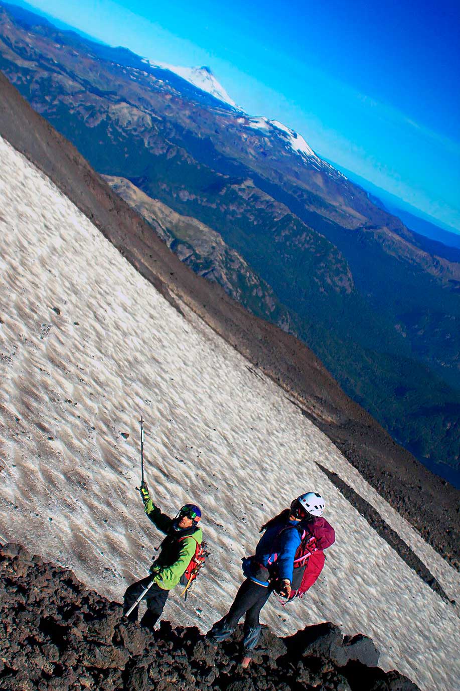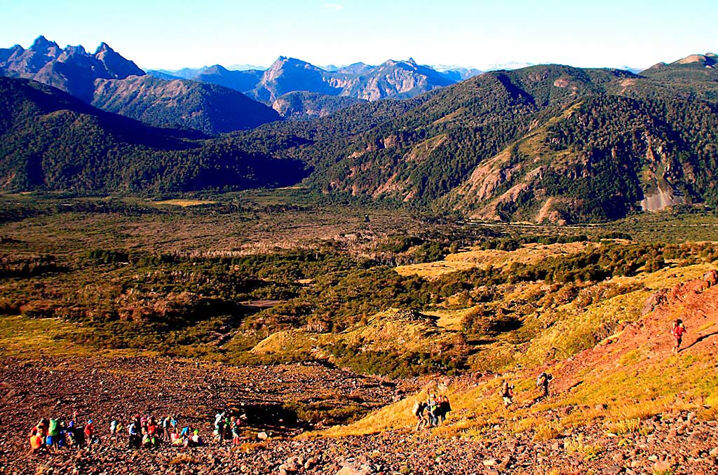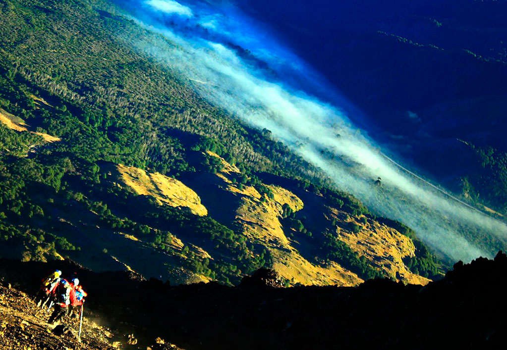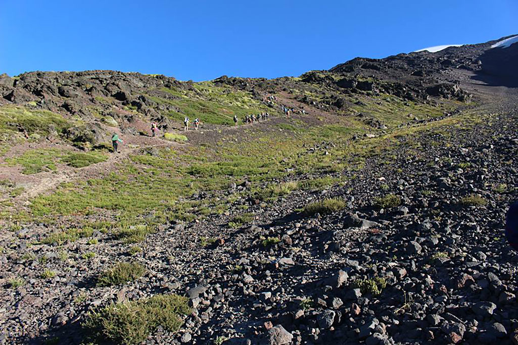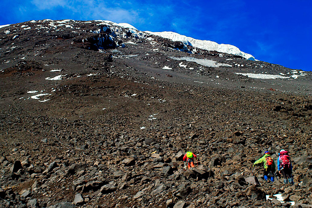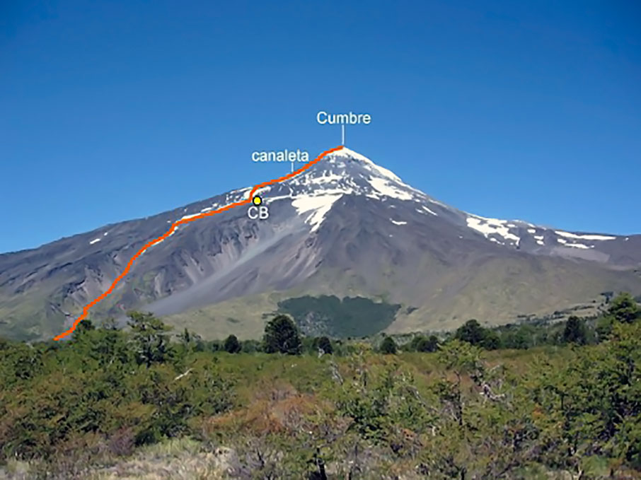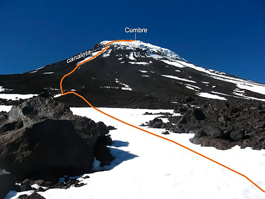 Desde el CB comenzar a caminar temprano subiendo en dirección sureste. Luego de 2½h se alcanza la base del sector conocido como “la canaleta” (3000m), aunque tiene una anchura de más de 100m. Este lugar es relativamente plano y permite hacer un último descanso antes de encarar el tramo final hasta la cumbre. Además, es el punto donde la vía empalma con la ruta normal proveniente desde los refugios argentinos. La huella es bastante visible debido a que es transitada con regularidad en verano, en el caso de no encontrarla a causa de la nieve, es conveniente abordar este canalón por el lado derecho (oeste) hasta llegar a un roquerío desde donde los últimos metros transcurren por gravilla antes de encaramarse sobre el hielo que cubre completamente la cumbre, y que es el origen del gran glaciar que desciende hacia la imponente y técnica cara sur. La cima se alcanza tras 1½h desde el inicio de la canaleta, desde ella es posible divisar en días despejados la mayoría de los volcanes y lagos de esta zona. El regreso toma 4h por la misma ruta de ascensión.