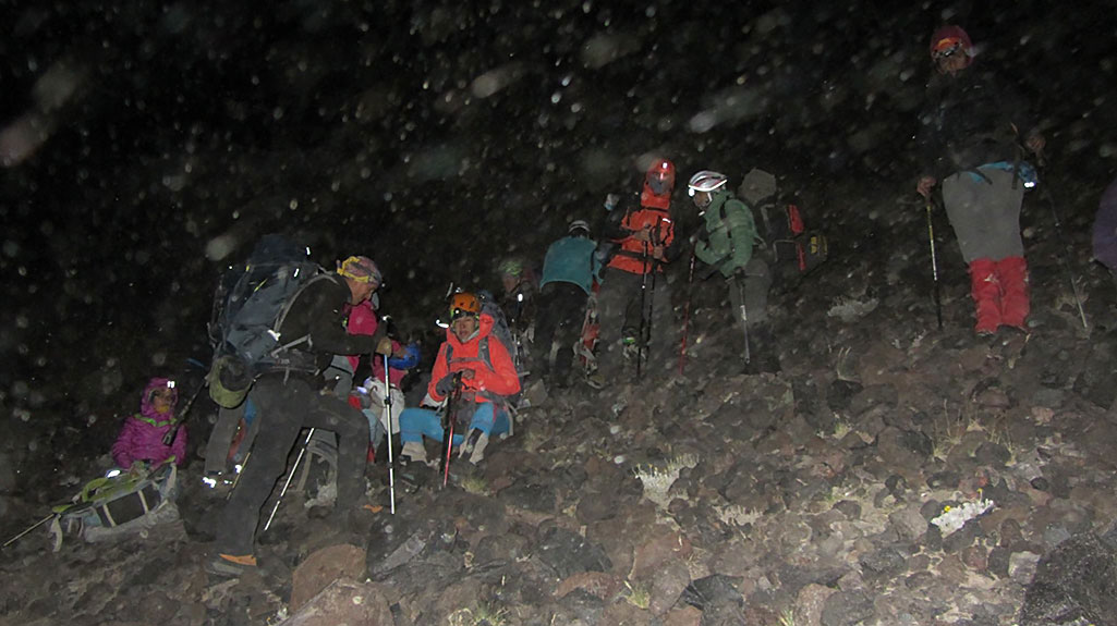 Durante el trayecto nos encontró la noche subiendo por el acarreo, el cual dificulto el paso de muchos de los integrantes del grupo debido a la caída de piedras constantes, ocasionando el accidente de un muchacho (el cual fue socorrido, inmediatamente por dos integrantes que llegaron en ese momento al punto del suceso) y que la medico del equipo Ester Maier Flores trato eficientemente en terreno las heridas del afectado una vez que fue sacado del lugar en el que se encontraba.