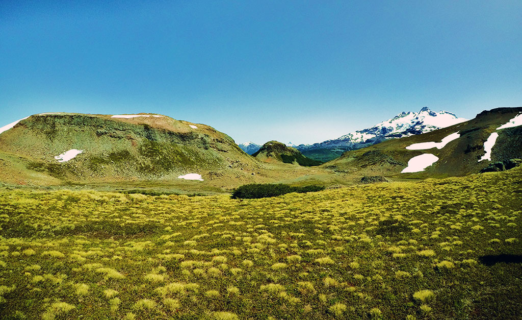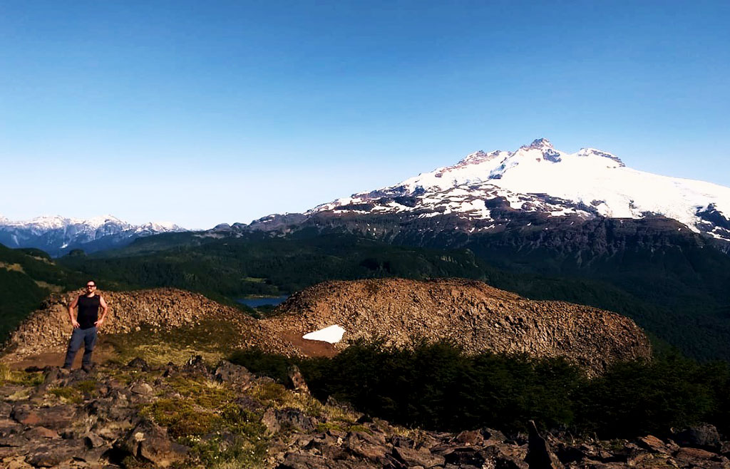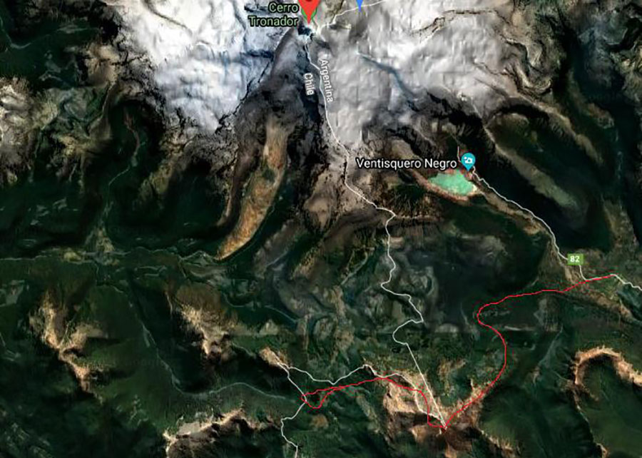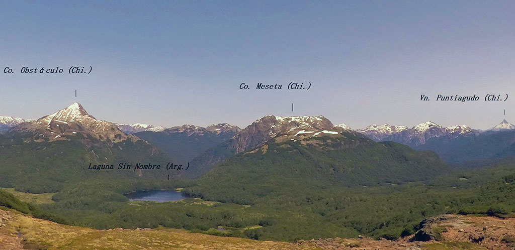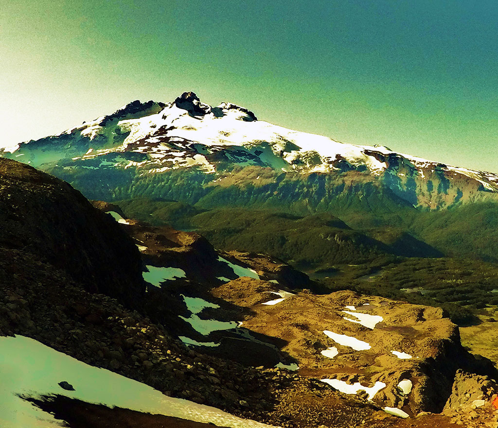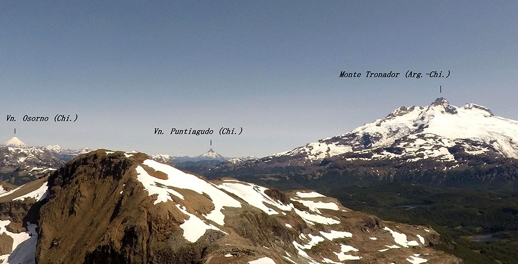 Por otro lado, y continuando el ascenso, luego de atravesar pequeñas zonas de mallines (con el Monte Tronador presente a la vista), se comienza a modificar el ambiente de bosque por el de roca y arbustos bajos, permitiendo montarse en el lomo noreste del cerro, ya a unos 1500 metros de altura. Para los que precisen de mayores comodidades (lo cual no fue nuestro caso) la utilización de polainas permite evitar la molestia del ingreso en las botas de las pequeñas piedras volcánicas variopintas, al momento de transitar el cono volcánico. Finalmente, el inicio del último tramo de ascenso, se realiza oscilando el paso de un lado al otro en la imaginaria línea limítrofe entre Argentina y Chile que delinearía el Hito VIII-8 A.