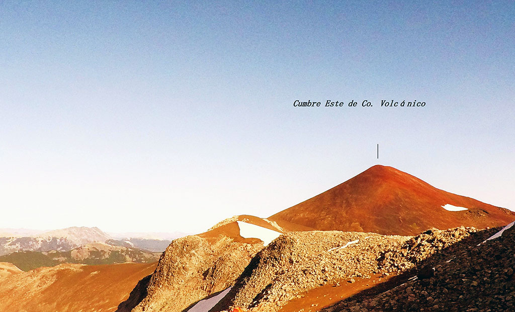 A partir, aproximadamente, de transitar un kilómetro y medio de la cumbre Este, en sentido noroeste, y en el filo por donde empieza a perder altura el cerro, puede avistarse la Laguna Sin Nombre, adornada en sus laterales, como si fueran dos columnas arquitectónicas, por los cerros chilenos Obstáculo (1880 m) y Meseta (1790 m). El recorrido por la ladera norte del cerro Volcánico supone un trekking mixto en roca y nieve. En verano, puede que la capa de nieve suelta sea poco profunda y se encuentre nieve cristalizada a pocos centímetros.
