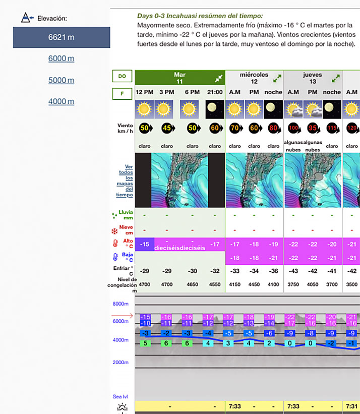 Actualmente la temperatura de acuerdo al reporte de Mountain Forecast es de -16 grados y sopla un viento de 40 km/h, llevando la sensación térmica a - 37,5 grados.
