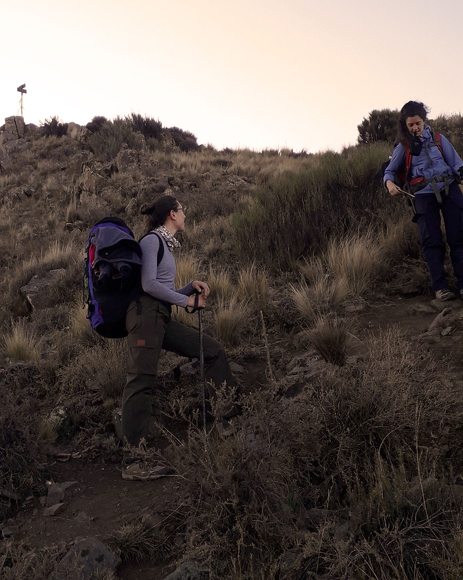 Después de un rato, retomamos el camino de regreso. Llegamos al campamento para armar nuestras mochilas y seguir el descenso. En el camino íbamos solas, ya no había más gente y vimos cómo el sol se escondía, nos quedaba todavía un poco de luz. Ya se empezaba a ver la ruta, pero antes de llegar se hizo de noche y aunque estaba la luna acompañándonos, tuvimos que prender las linternas. En un momento, perdimos el camino y nos preocupamos un poco, estábamos cansadas, las mochilas pesaban el doble y seguíamos sin encontrar el sendero. Después de unos minutos pasamos por un cable que estaba tirado en el piso y nuestra compañera Estefi, recordó haber pasado por ahí a la ida y con alegría dijo: Vamooos bien, ¡este es el camino! Y además al ratito observamos una luz que nos alumbraba desde muy abajo, era el Señor José con su linterna que nos había visto de muy lejos. Esperó hasta que llegáramos a donde él estaba y cuando al fin llegamos nos decía, ¡nada como pisar tierra firme ! Y si, nada como llegar sanas y todas juntas al final.
