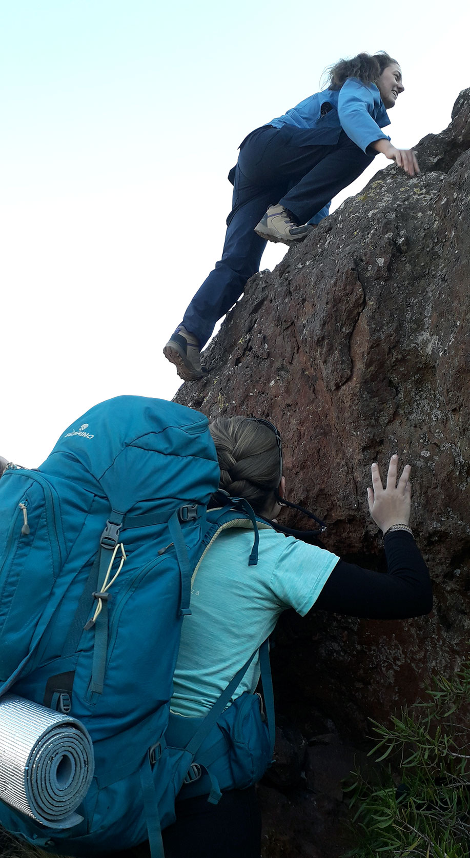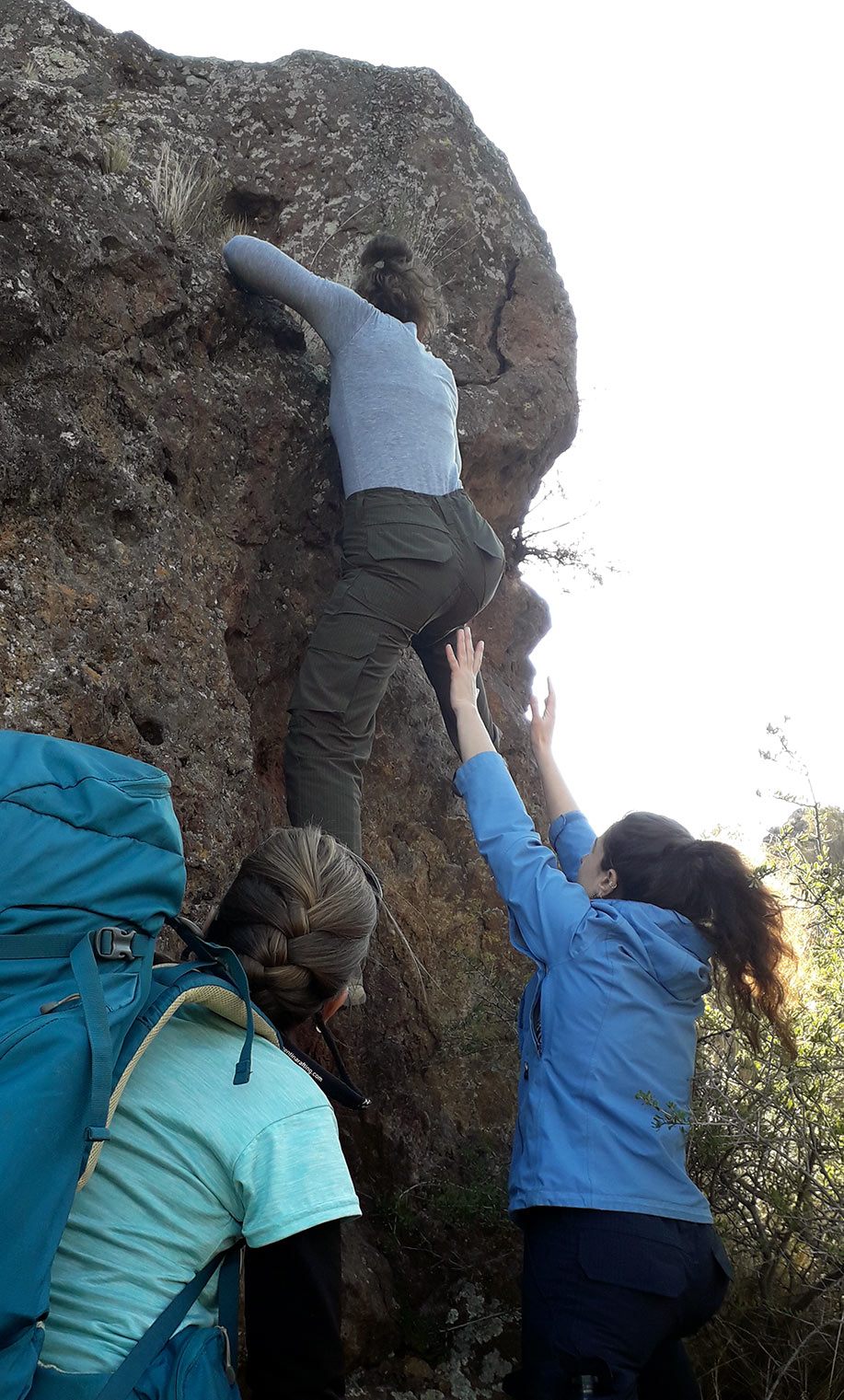 En el camino encontramos una gran roca que se prestaba para hacer un boulder. Dani, que practica escalada en palestra, lo vio y no dudó en sacarse la mochila y empezar a trepar. Todas empezamos a alentarla y teníamos ganas de intentar también porque, además de subir cerros, nos gusta mucho ir a escalar, pero había que guardar energías…