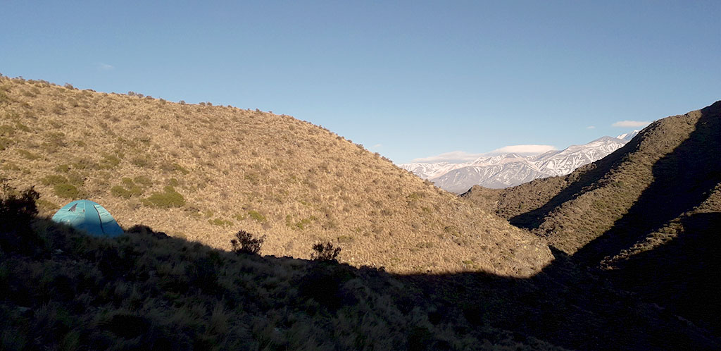 Al llegar a la cumbre, entre abrazos y risas, pudimos apreciar el sol esconderse entre los picos nevados del Cordón del Plata. El sol nos recargó de energía y paz para seguir hasta donde sería nuestro lugar ideal para pasar la noche, un valle rodeado de montañas que nos refugiaria del viento. Antes de oscurecer, armamos la carpa y empezamos a cocinar junto con unos amigos de la montaña que nos encontramos en el camino. Compartimos una rica comida con unas verduras asadas, y unos vinos.