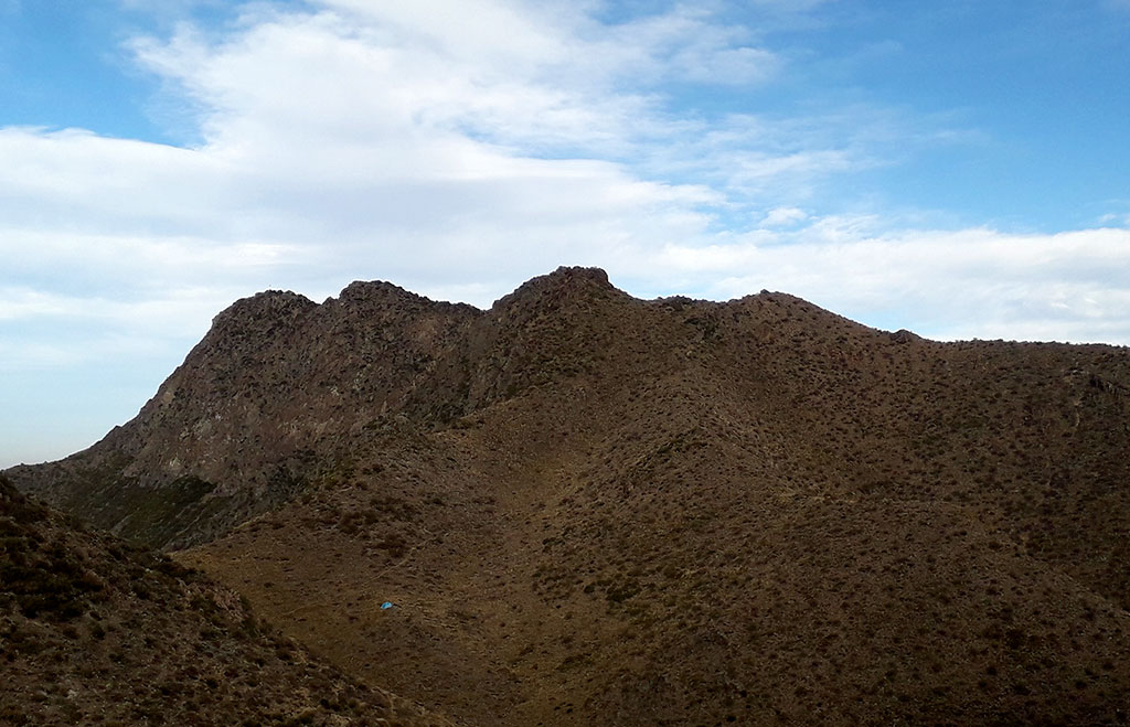 Nos despedimos de nuestros compañeros y de a poco fuimos caminando por un sinuoso camino y así fuimos calentando nuestros cuerpos. Nos acompañaba un cielo despejado y un hermoso sol. Llegando al Cerro Manos nos desorientamos por un momento, Estefi, caminó hacia un morrito para ver si encontraba algún camino, y se topó con la maravillosa vista del Cerro Plata y Vallecito.