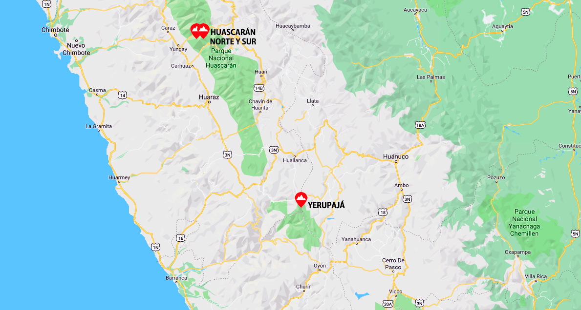 El Yerupajá es la segunda cumbre del Perú y se recorta con dos caras que se unen en un largo y afilado filo que alinea tres cumbres: el Yerupajá Norte (6.430 m), el Yerupajá Grande (6.617 m) y el Yerupajá Sur (6.515 m). Ubicado en la parte central de la Cordillera Huayhuash, al norte se eleva, luego de un alto collado el Yerupajá Chico (6.089 m), aunque a modo de joroba entre éste y el Yerupajá Grande se encuentra el Toro (5.830 m), una cumbre redondeada pero no carente de espectacularidad. Al sur se eleva el macizo del Siula, con sus 4 cumbres y al este los Rasac.