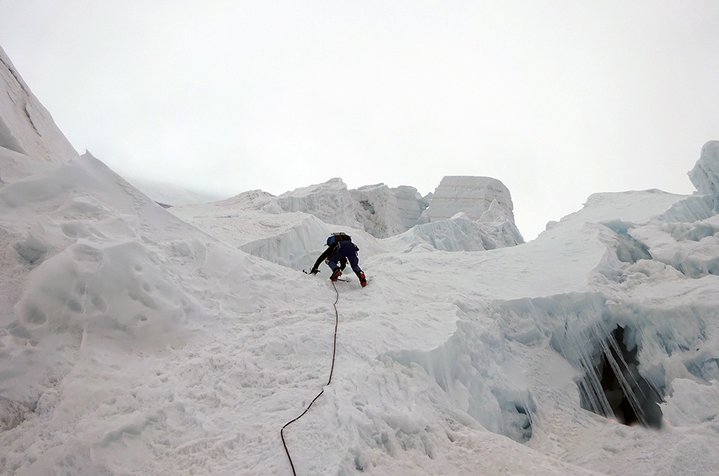 Finalmente el 24 acamparon en el plateau a 5250 metros para iniciar la escalada el 25. Debido a la inestabilidad de la pared, partieron a las 20 hs y velozmente escalaron la pared. Desde el campamento cruzaron el plateau navegando entre las grietas hasta un puente de hielo que les permitió subir a la pared. La primera parte fue por nieve – hielo duro de 60 a 70 grados, pero luego la nieve perdió consistencia. Llegando a la arista, debieron realizar una travesía debajo de grandes bloques de hielo para alcanzar el col entre la cumbre norte y la principal a las 00,30 hs del 26. Pasada la medianoche, y con la luna saliendo del otro lado de la arista, superaron la cresta y al avanzar por la misma la notaron inestable. Unos metros mas adelante un crujido les hizo decidir poner fin al intento y volver sobre sus pasos para iniciar los rapeles.