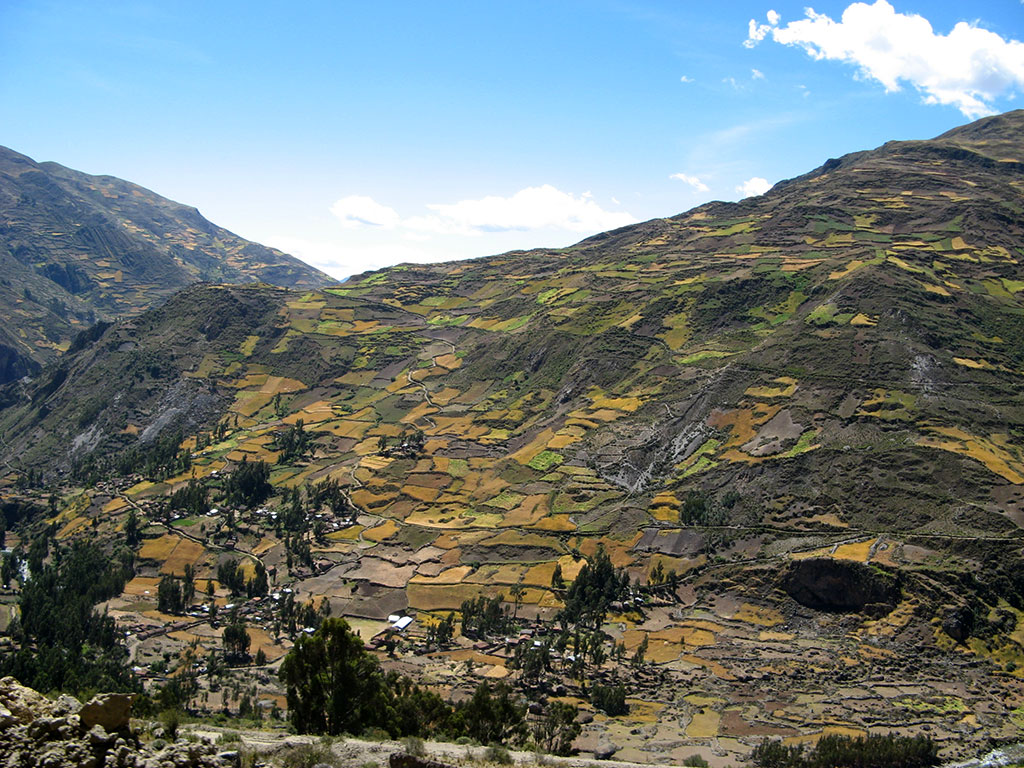 Desayunamos y subimos al centro desde donde partía el micro para la excursión que contratamos a Vladimiro (nuestro contacto/intermediario) para visitar las Ruinas de Chavin de Huantar, al otro lado de la Cordillera Blanca. Para llegar, recorrimos hacia el SE de Huaraz, 109 km de carretera donde paramos en algunos miradores para observar la imponente Cordillera Blanca. También paramos en la laguna de Queracocha a más de 4000 metros de altura y terminamos saliendo a la zona de "los conchucos" del otro lado de "la blanca" luego de atravesar un túnel a unos 4500 msnm. Los kilómetros próximos a Chavin presentaban unos paisajes increíbles con laderas de cerros cultivados en lotes componiendo imágenes únicas. Según Jack, el guía de ese día, el cultivo era cebada que la comunidad (muy bien organizada) lo vendía a una cervecería. Las Ruinas de Chavin son el legado de una civilización que habitó la zona desde unos 1200 años a.C. y que a juicio del guía, si no hubieran sido tapadas por un aluvión en 1940, su importancia arqueológica sería mayor a la de Machu Picchu, no solo por su antigüedad, sino también por sus dimensiones. Las ruinas fueron tapadas cuando una laguna se vino encima producto de la ruptura de un dique natural. Las mismas consisten en construcciones y templos que recibían peregrinaciones de los alrededores. En el lugar, se pueden ver las edificaciones de una gran complejidad, considerando la época: plazas, canales subterráneos de agua y diversos tallados y esculturas donde prevalece la "trilogía andina". Entre ellos, "El lanzón de Chavin" que aún permanece en el sitio; el obelisco y la estela han sido retirados a museos. Otro de los elementos característicos en el lugar son las "cabezas clavas" en cuyo templo principal solo queda en sitio una y el resto sigue en una sala construida en la actualidad donde además se encuentran otras artesanías.