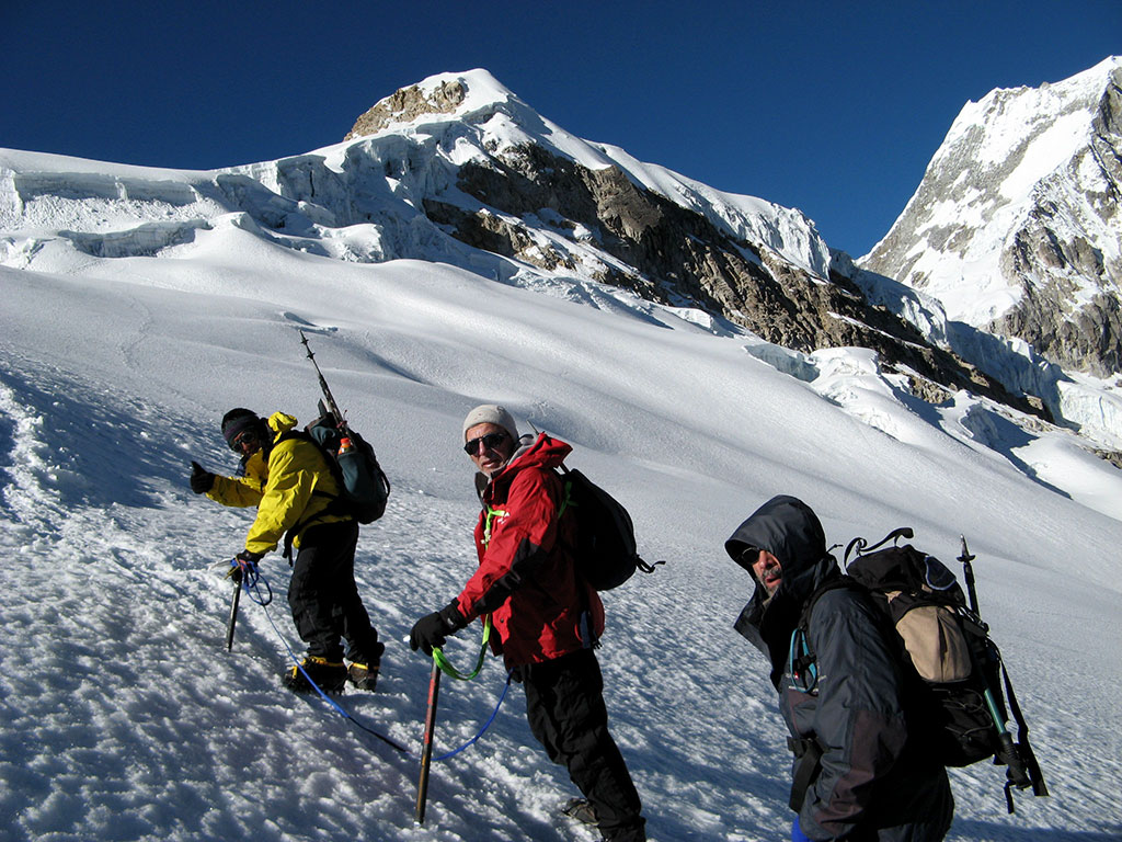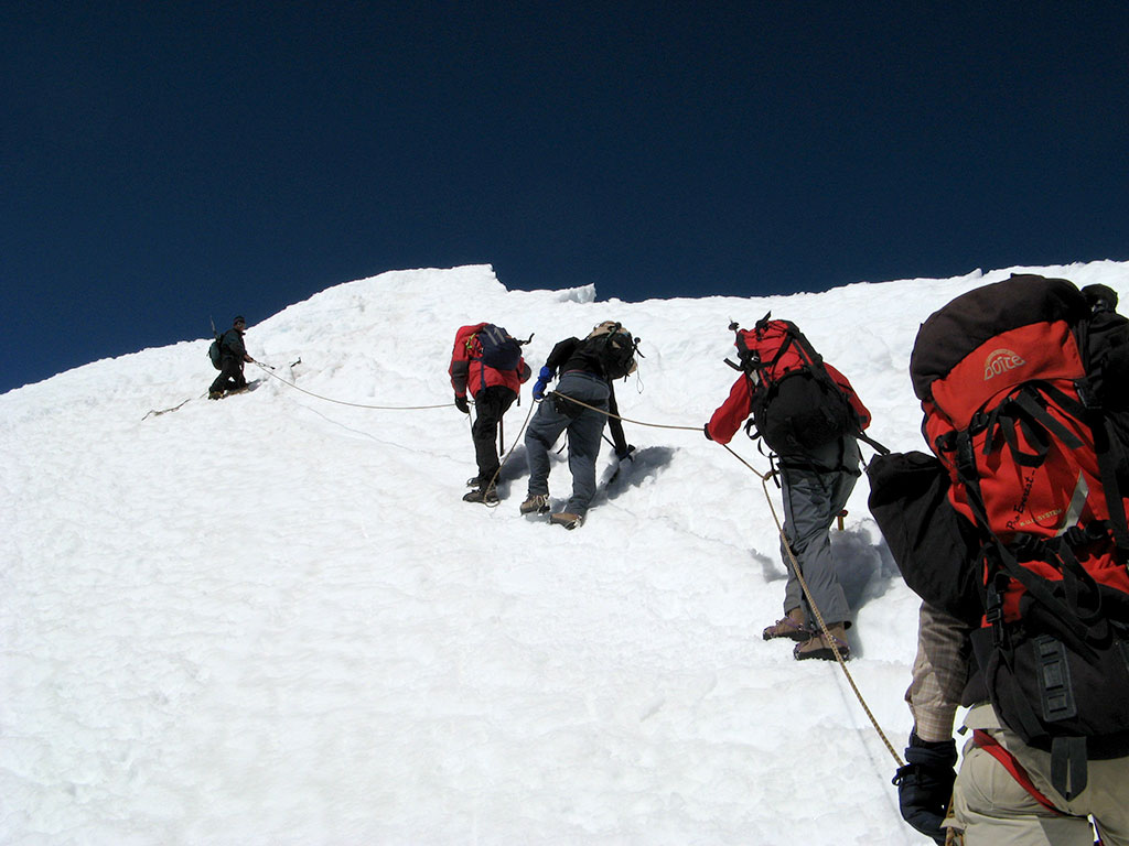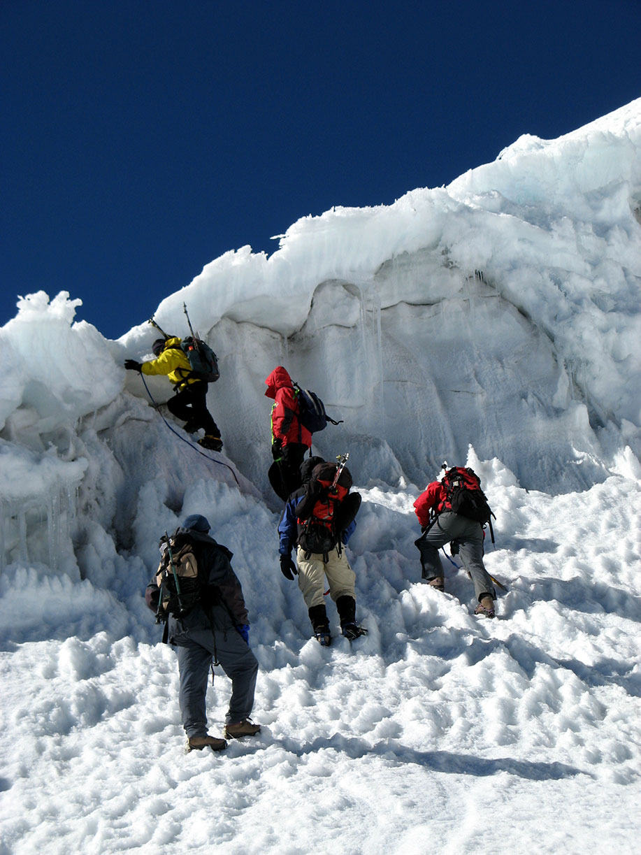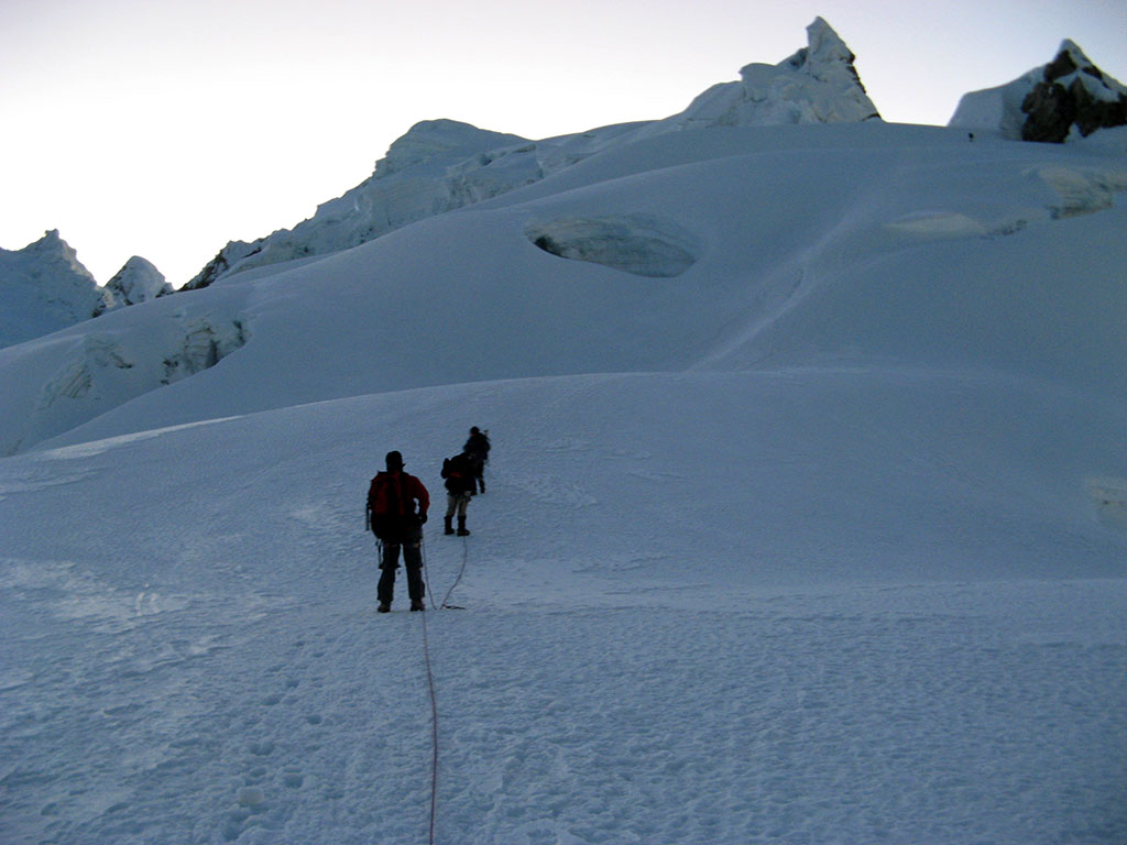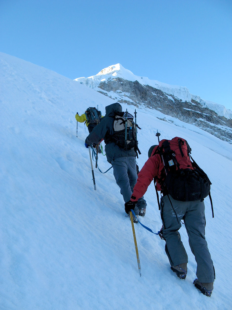 Seguimos subiendo hasta que el sol comenzó a iluminarnos de lleno. En uno de los descansos, se nos reunió una francesa que esperaba a un compañero. Seguimos subiendo hasta toparnos con un escalón de hielo muy pronunciado donde Wilder nos debió asegurar de arriba con una cuerda mientras nosotros traccionábamos ayudados por los grampones y la piqueta. Una vez arriba, seguimos avanzando con la cumbre a la vista y mucho más cerca, pero viendo paredes y rimayas formadas por el quiebre de los glaciares. La progresión fue lenta hasta detenernos a unos 60 ó 70 metros del final. La pendiente más pronunciada a la que me había enfrentado hasta el momento se interponía entre la cumbre y nosotros. El guía sacó su cuerda, la preparó con 5 nudos "ocho" y subió hasta que no hubo más cuerda para clavar una estaca en el lugar, Desde ahí, nos fue dando seguridad mientras los cinco, al mismo tiempo, subíamos como si fuera una escalera con la ayuda de la piqueta tal como lo habíamos hecho unas horas antes cuando recién entrábamos en la nieve. Esto requirió que el grupo avanzara como una sola persona y que si uno se detenía, todos lo hiciéramos asegurándonos al suelo con el piolet. Al llegar al guía, nos aseguramos con grampones, piqueta y con alma y vida, a la pendiente para permitir que él retirara la estaca y subiera nuevamente tanto como la cuerda lo permitiera. Clavó la estaca, avanzamos unos metros y volvió a subir la estaca para colocarla en el último y definitivo lugar que nos ayudara ir asegurados hasta lo más alto. El hecho de que la nieve no estuviera muy dura, nos facilitaba las cosas tanto a nosotros como a la pareja de franceses que nos pasaba por la izquierda a más velocidad producto de no ir asegurados.