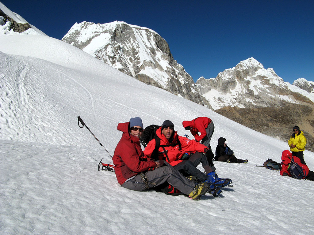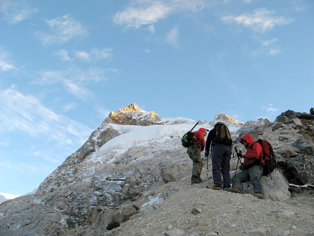 Allá por las 4 am, llegamos al hielo y paramos unos momentos para colocarnos los grampones mientras Daniel alistaba la cuerda para "atarnos". A nuestro lado, había unos europeos que habían partido esa mañana desde un campamento más alto que el nuestro, Campo Morrena y, en esos momentos, se encontraban con los mismos trámites que nosotros.