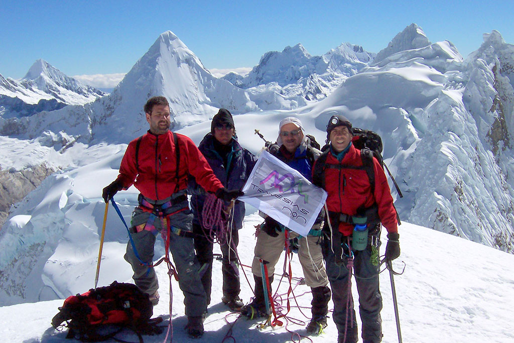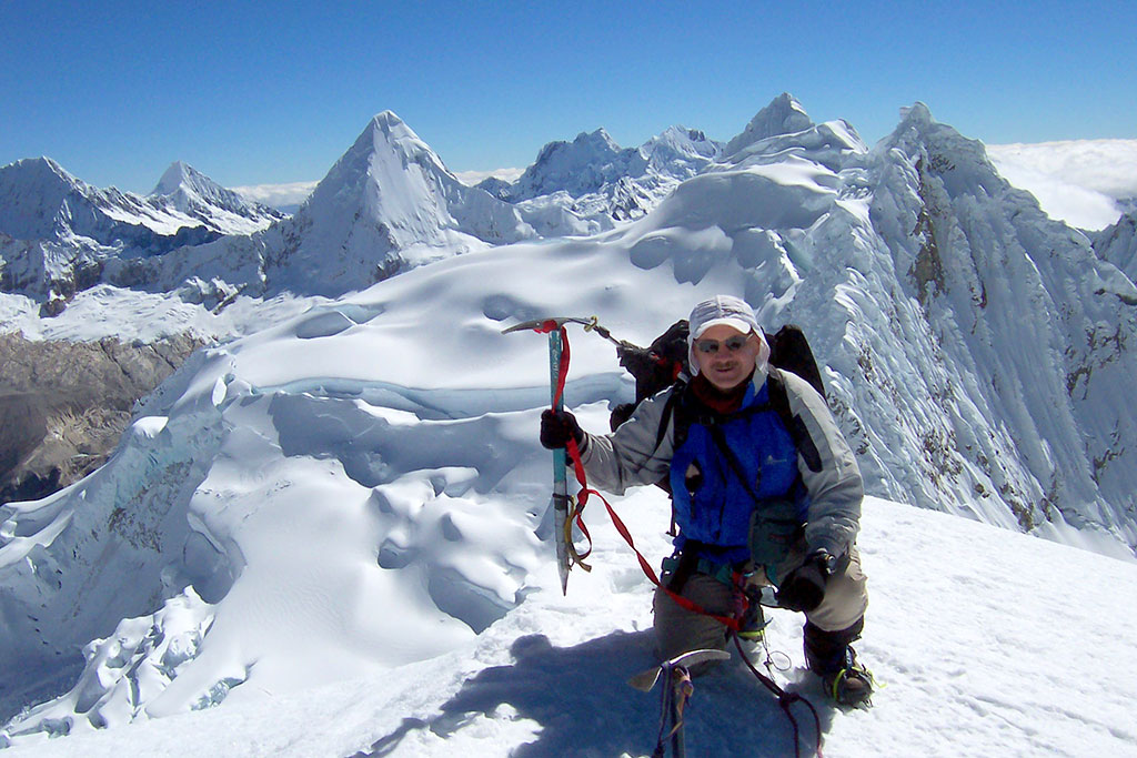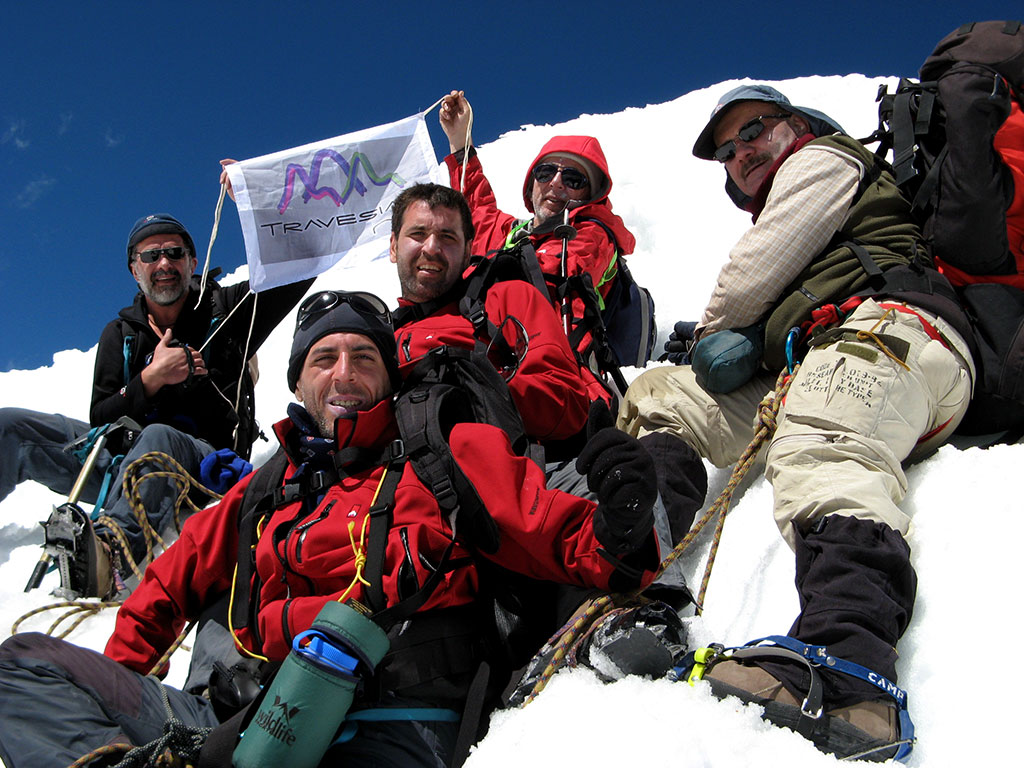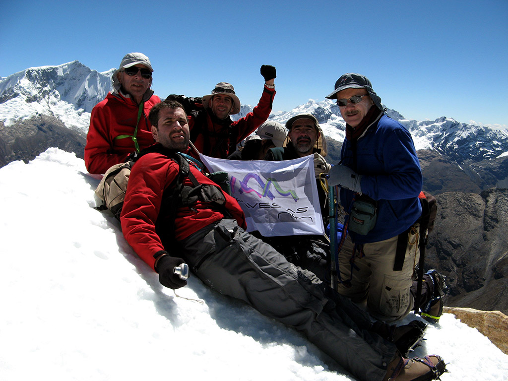 La forma de trepar cansaba bastante y debimos parar varias veces a pesar de ver el final muy cerca. De pronto, todo se acabó. De a uno, según como veníamos en la cuerda, Pablo, Guille, Yo, Lorenzo y Fer, fuimos tomando posición en el lugar mínimo que tenía por estos días la cumbre del Ishinca. Para un lado, el vacío, para el otro, la pendiente abrupta que acabábamos de superar, así que asegurados cada uno a su asiento con la piqueta, nos limitamos a festejos contenidos para no movernos demasiado y, a lo sumo dimos algún grito de alegría mientras observamos todo lo hermoso que nos rodeaba en ésta, nuestra nueva cumbre. Wilder hizo los desplazamientos más abruptos para buscar el mejor ángulo a fin de retratarnos con nuestras cámaras.