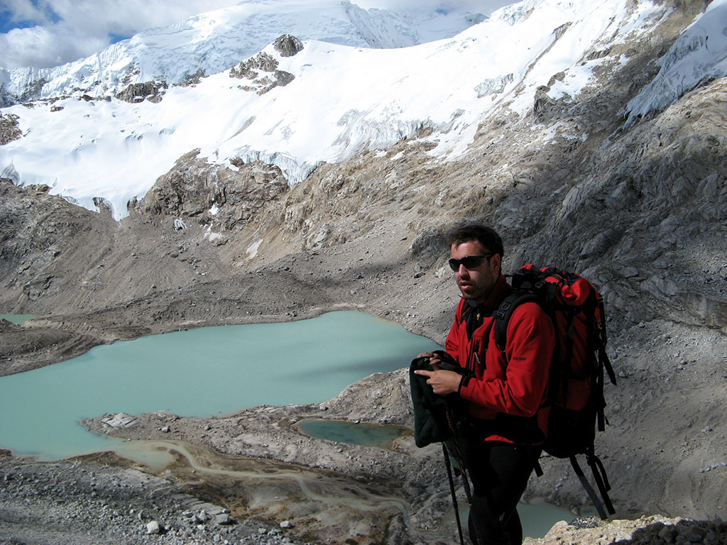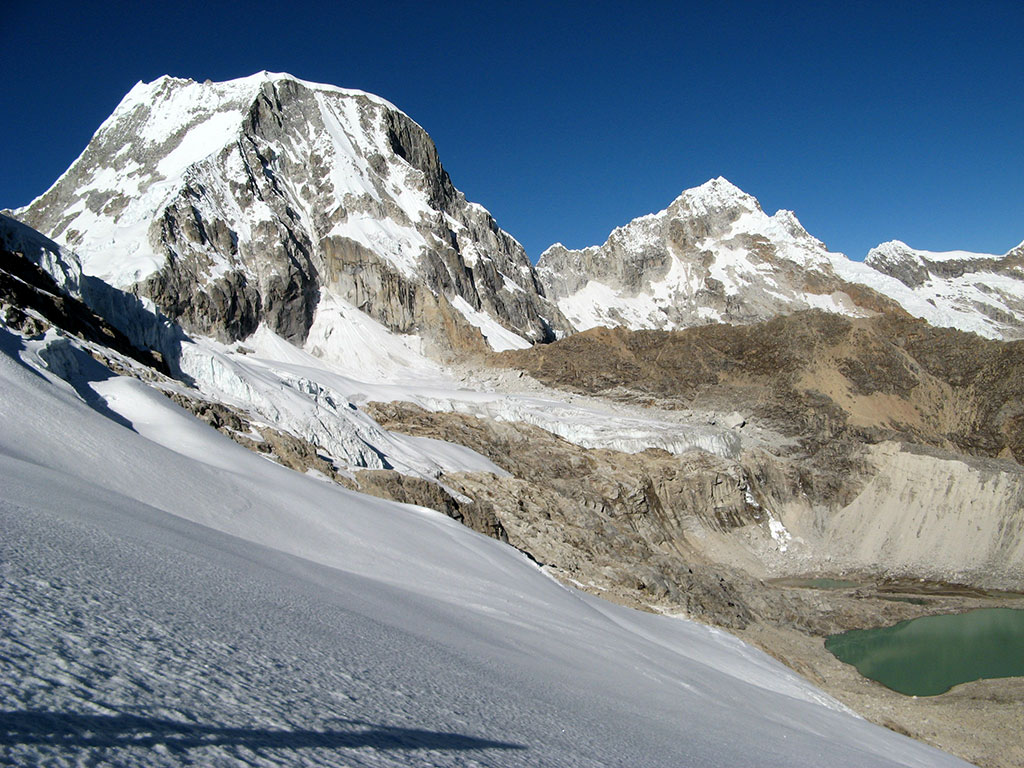 Continuamos el acercamiento. La senda seguía subiendo entre paredes inmensas que formaban la quebrada de Ishinca hasta arribar a los 4350 metros al campamento base. Un lugar que no pudo ser más hermoso con varios hilos de agua que bajaban de glaciares que teníamos a la vista y atravesaban una laguna que sólo puede verse cuando se sube a algunos cerros de alrededor. A la derecha el Ishinca que no se llegaca a ver desde el CB y a la izquierda el Urus, estaba nuestro próximo objetivo. Al fondo del pequeño Valle, la vista impacta con una inmensa y blanca pared de nieve compuesta por el Palkaraju y el Chinchey. Pegado, hacia la izquierda más imponente aún, el Toclaraju, uno de los tantos seismiles de la Cordillera Blanca. Algo más cerca, dos morritos más pequeños con una especie de morrena que se descolgaba entre ellos para ir ensanchándose poco a poco. Por ella brotaban hilos de agua alimentados desde más arriba por los glaciares.