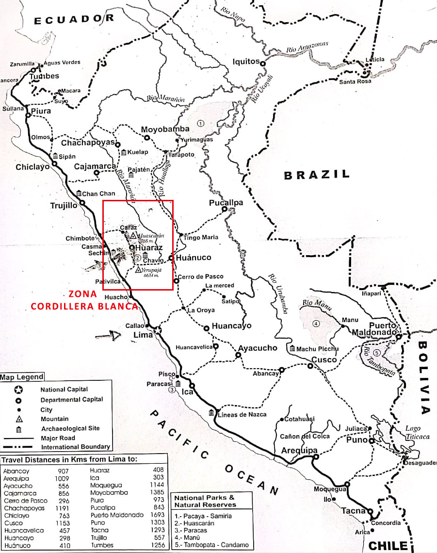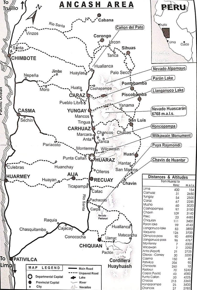 Al final del trayecto del día dos, se ven los primeros nevados que nos empiezan a poner en tema de la imponente parte del mundo. A las 16 hs., llegamos a Huaraz. Es la capital del departamento de Ancash, está a 3.090 msnm y es la principal ciudad en el Callejón de Huaylas. Ciudad pujante, reconstruida en partes, tiene múltiples servicios de alojamiento y de gastronomía. Es a su vez la base para múltiples actividades de montaña, debido a su ubicación geográfica y a sus múltiples recursos logísticos, esto es: asociaciones de guías, agencias para diversas actividades de montaña, alquiler de equipos etc.