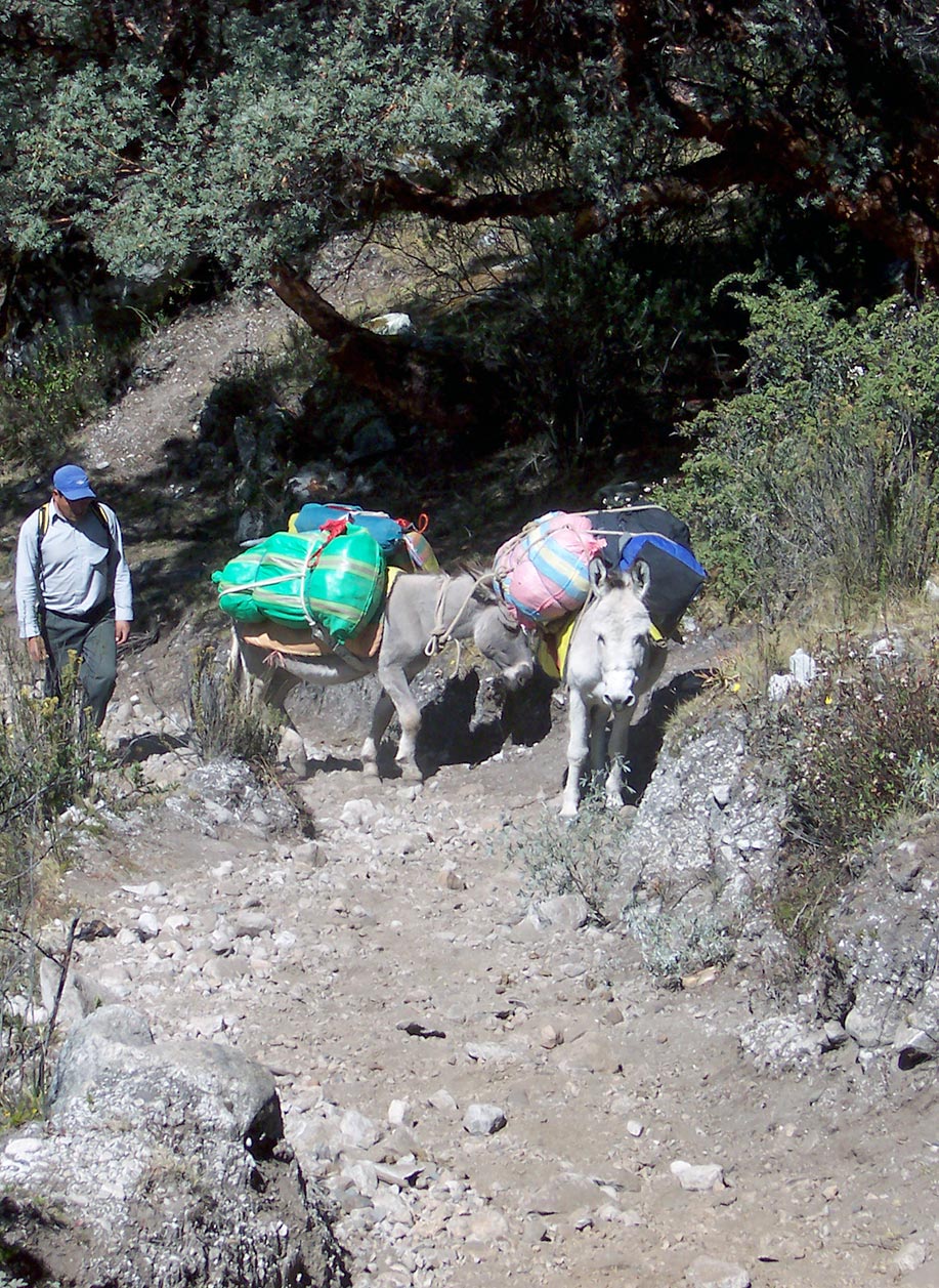 Con el pecho inflado porque la de ayer había sido otra gran cumbre y porque no nos había sido nada fácil pero la habíamos conseguido con mucho empeño, desarmamos todo y salimos rumbo a Cebolla Pampa para tratar de conseguir un taxi que nos arrimara de regreso a Yungay. A paso tranquilo, desandamos el camino que nos había llevado al Campo Base y siempre con el Pisco que no guiñaba un ojo a nuestras espaldas. Por su parte, el arriero con sus burros bajaba lo más pesado del equipo.