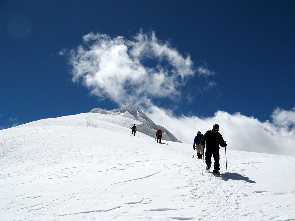 Siempre me ayuda ascender de noche porque las referencias son cortas y la ansiedad de llegar a tal o cual lugar más arriba no juega en contra. Así fue como subimos lentamente y el guía fue "haciéndose" a nuestro ritmo. El amanecer nos encontró terminando una senda bien marcada y empezando a atravesar una parte de roca bastante trabada que nos obligaba a pasos poco ortodoxos y a avanzar bastante lentos. Aproximadamente una hora más tarde llegó la nieve y con eso se fueron algunos fantasmas. El zigzag ya estaba algo marcado por quienes habían pasado antes y la dureza de la nieve estaba justa para ir subiendo seguros por lo que se acabó la discusión sobre "cuerda si o cuerda no, estaca si o estaca no". Una vez superada la pala de nieve, llegamos a una especie de plateau donde descansamos, sacamos unas fotos y disfrutamos de un paisaje increíble. La cumbre estaba a la vista pero aún faltaba. Una pala más de nieve y con menos pendiente que la anterior para llegar a una última parte de roca que obligó a Wilder a asegurarnos con su cuerda en más de una oportunidad. El grupo seguía avanzando bien y ya estábamos hacía mucho sobre los 5000 metros de altitud, solamente a Noemí le dolía un poco la cabeza, pero la meta estaba muy cerca. Un último aliento de Wilder, nos bastó para seguir subiendo hasta que ya no se pudo ir más alto. Los siete nos abrazamos envueltos en esa sensación increíble que solo las cumbres provocan, el poco espacio nos obligó a sentarnos asegurados cada uno con su piqueta para las fotos, algunos gritos, muchísima emoción hasta que llegó la hora de bajar con mucho cuidado por la pequeña plataforma cumbrera donde estábamos, la que se cortaba con un filo brusco hacia el lado opuesto al que arribáramos.