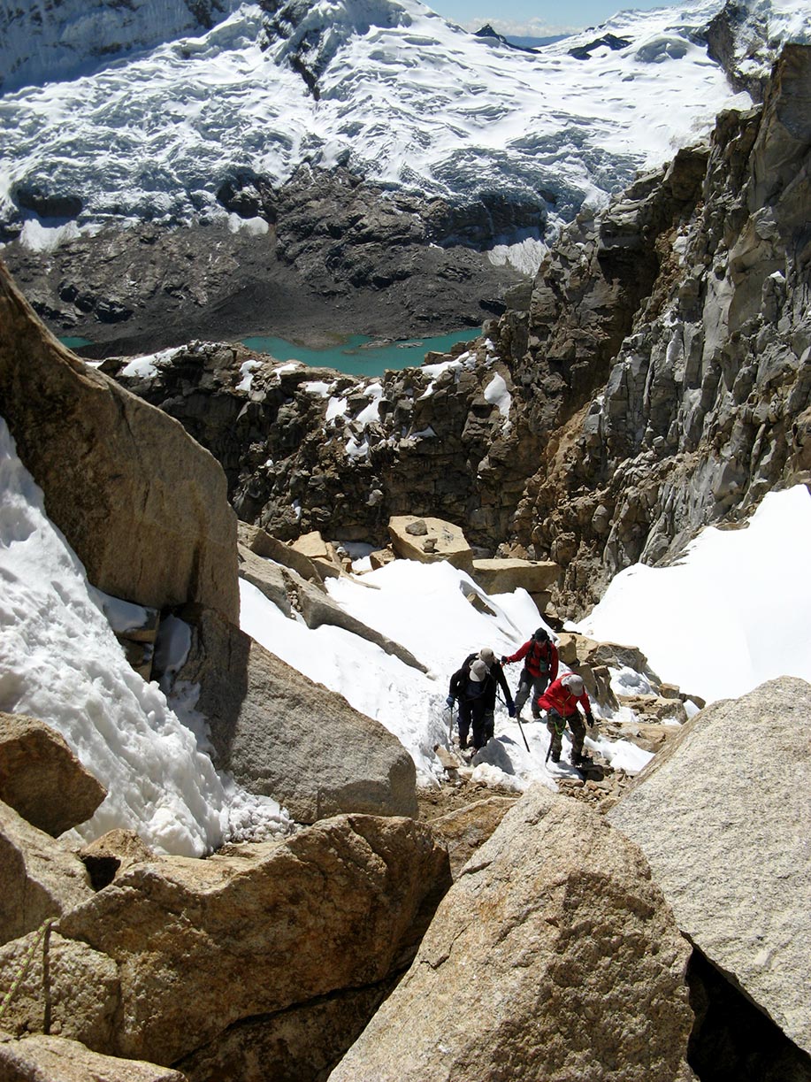 En pocos minutos, empezamos a bajar uno a uno, rapeleando hacia la cara opuesta de la montaña a la de nuestra llegada. Primero Fer, luego Lorenzo, yo, Guille y Pablo para esperar al guía y verlo bajar al trote la pendiente que nosotros hicimos asegurados con un rapel. Ahora sí. En un lugar seguro es donde damos rienda suelta a saltos, abrazos, besos y felicitaciones por lo que acabábamos de lograr. En unos 40 minutos, salimos de lo blanco, atravesando glaciares que se descolgaban desde la cumbre hacia esta ladera de la montaña. No eran pocas las grietas que se veían y no era poco nuestro asombro al girar y mirar atrás para disfrutar de toda la hermosura de la cumbre donde habíamos estado. Al final del hielo que fuimos dejando atrás con el Ranrrapalca como imponente testigo a nuestra izquierda, aprovechamos para sacarnos los grampones, comer y librarnos del exceso de ropa.