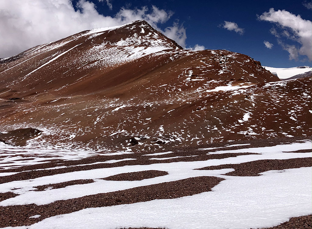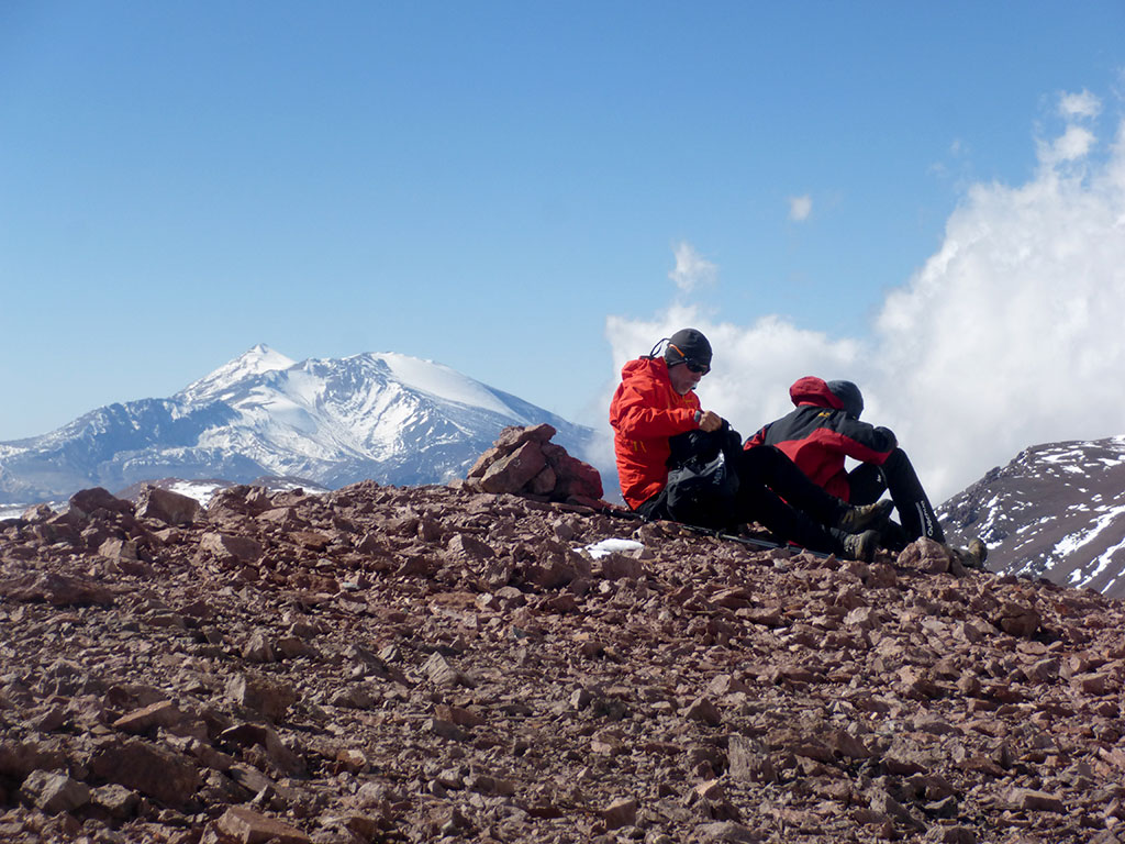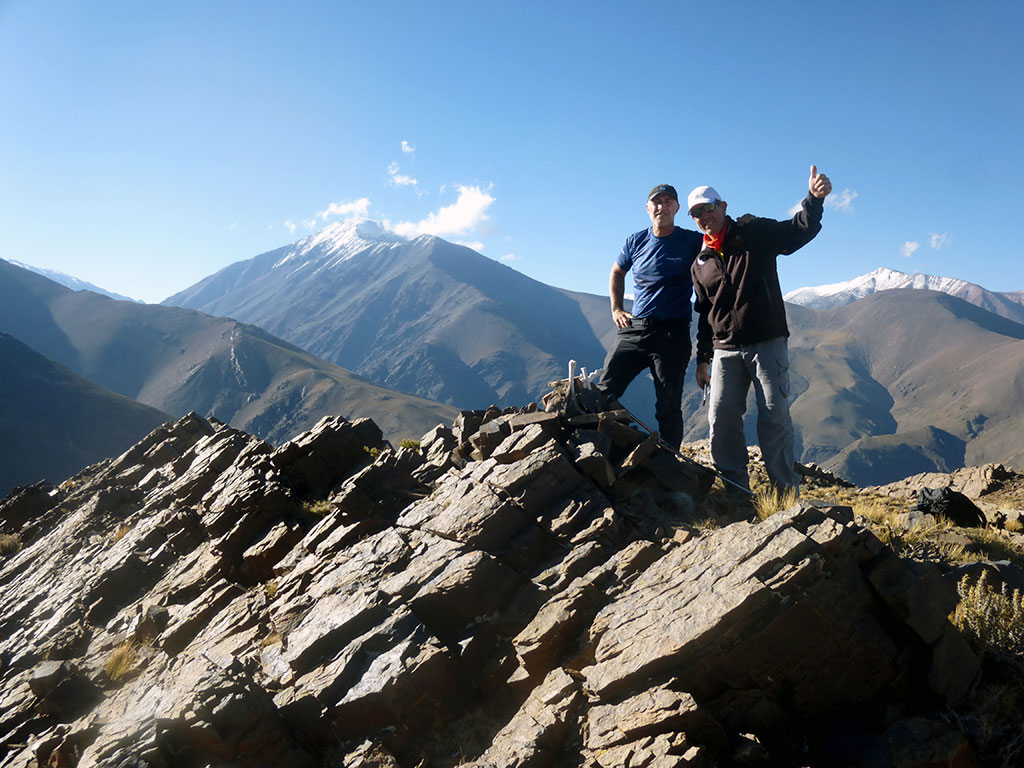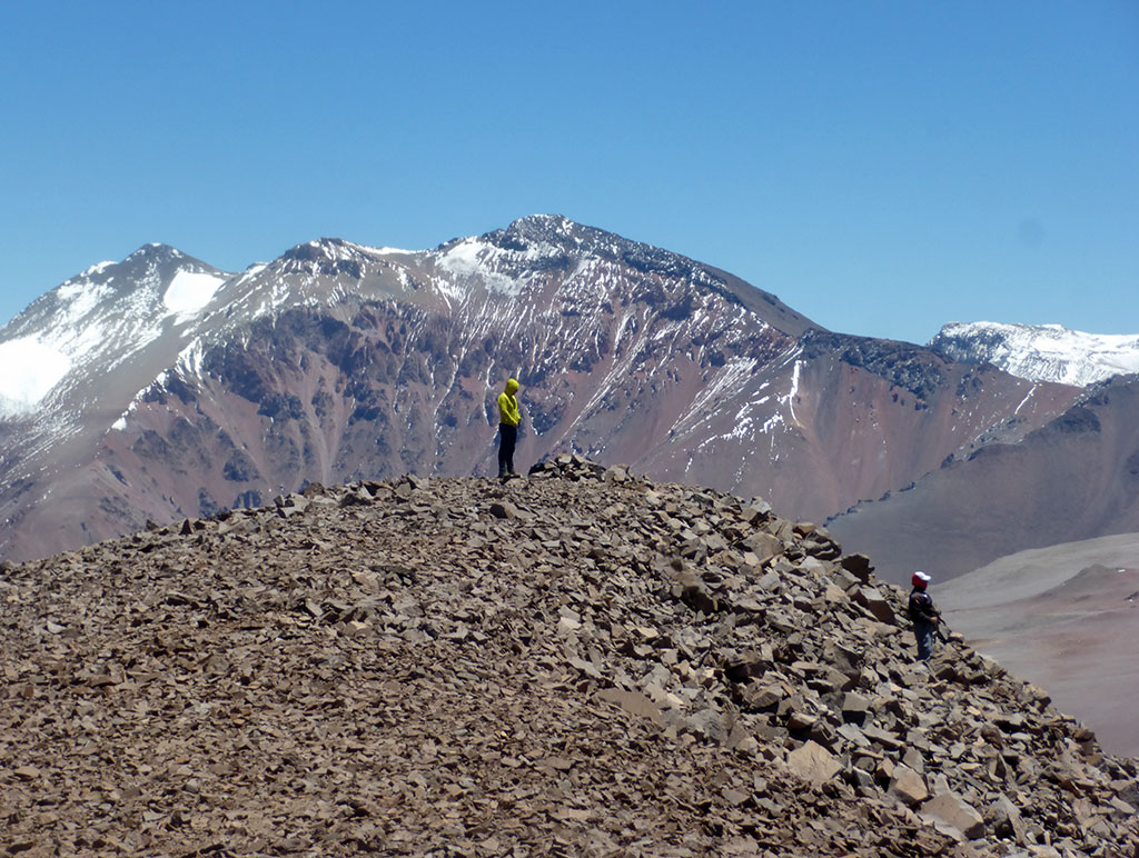 En esta oportunidad, al llegar, nos decidimos por un objetivo que requería menor esfuerzo: el pico Gabriela Mistral (5.051 m), antes llamado cerro del Portezuelo de Agua Negra, ubicado sobre el paso y donde solo hay que salvar algo más de 300 metros de desnivel. El recorrido nos llevo una hora y ya en el punto más alto (30°11'18.0"S / 69°49'0.3"O), pese al fuerte viento, nos cobijamos tras unas rocas y tomamos unos mates con bizcochitos y fruta, haciendo las veces de un almuerzo. Desde este mirador, delineamos los próximos días, eligiendo para el día siguiente un objetivo mayor, el Cerro El Bermellón (5.573 m), que requeriría superar 1500 metros de desnivel y recorrer algo más de 12 km entre ida y vuelta.