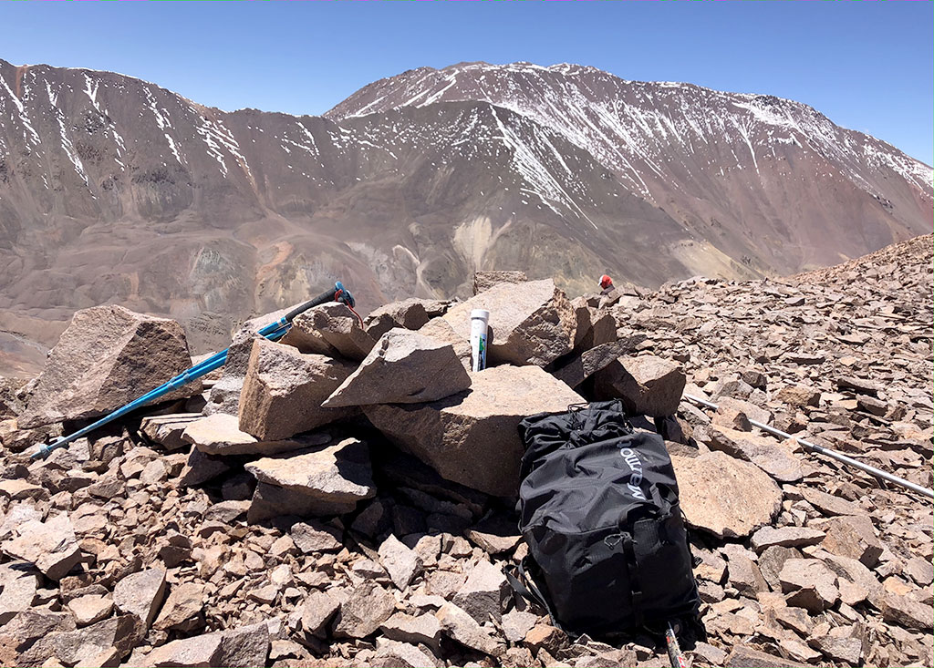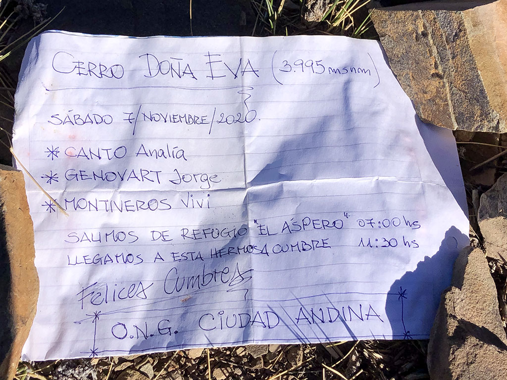 Con calor comenzamos a ganar altura por las faldas pedregosas cubiertas de pastos duros y vegetación achaparrada espinosa. Luego de una hora de ascenso, la brisa convirtió el caluroso ascenso en una marcha agradable para completar el trayecto hasta el primer promontorio que intuimos era el llamado Co. Reparito. Unos huesos de una osamenta olvidada por allí marcaban el punto individualizado. El GPS indicaba los 3.780 m que buscábamos. Continuamos por el filo amplio y cómodo hacia otro roquerío que se recortaba sutil en el mismo. Camino a él encontramos unas llamativas plantas con “bolitas” y se nos ocurrió que el topónimo quizás estaba vinculado con esto. En este punto indicado como Co. De las Bolitas (3790 m) no había más que unas rocas apiladas toscamente. Ahora el viento le ganaba a la brisa y fue necesario sacar abrigo de la mochila para seguir hasta el último punto del recorrido, donde encontramos entre las piedras del mojón que señalaba el final de nuestro recorrido, un testimonio que confirmaba que estábamos en el punto conocido como Co. Dona Eva (3995 m).