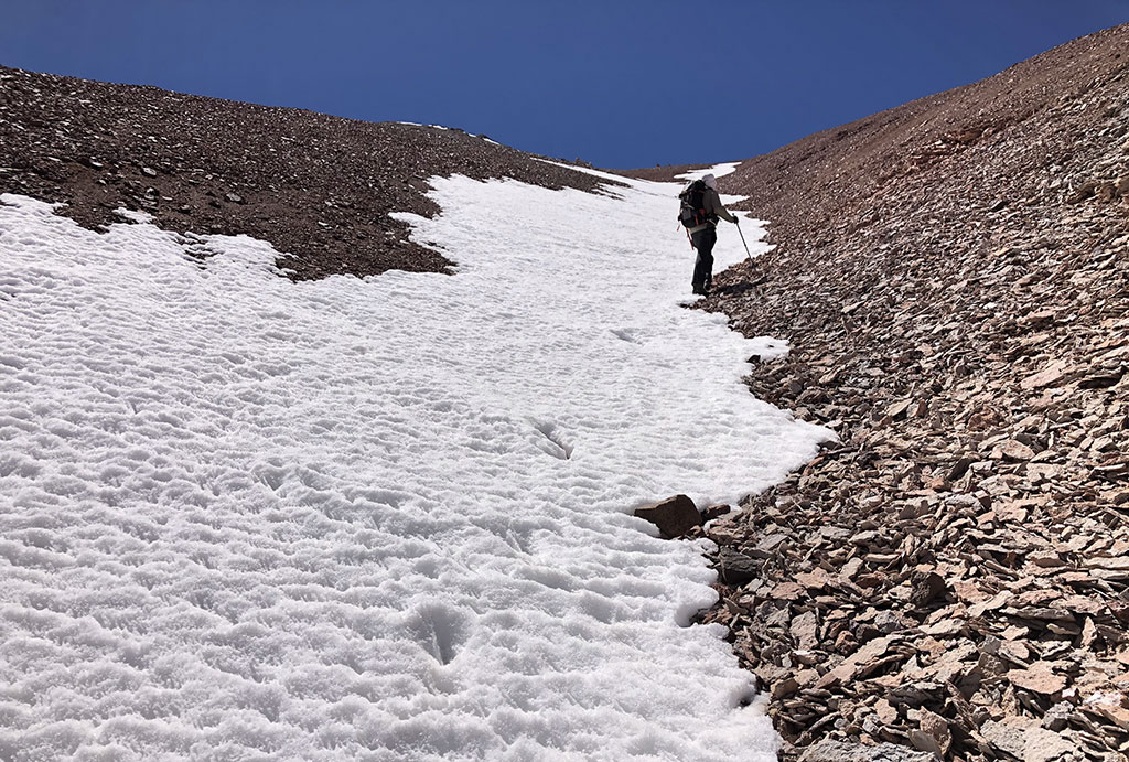 Al día siguiente partimos temprano, entre penumbras del refugio. Recorrimos 35 km hasta la zona conocida como Los Corrales, donde dejamos la camioneta a la vera de la RN 150. Comenzamos el ascenso por un canal que pronto requiere el uso de las manos para progresar y superar el corto tramo expuesto de unos 45° (30°13'41.50"S / 69°47'1.20"O, 4.370 m), pero que las rocas sueltas lo convierte en incómodo y algo peligroso. Luego de este resalte, pierde gradiente a unos 35°, y un hilo de agua indica lo que más arriba encontraríamos, el canal con nieve, lo que facilita la progresión. Las horas van pasando, con el sol todo es más fácil, pero el desnivel hay que salvarlo y no podemos perder tiempo. Finalizado el canal, llegamos a un plateau con una lagunita congelada (30°13'44.50"S / 69°45'53.10"O, 5.170 m), y arriba, ya vemos la pirámide cumbrera.