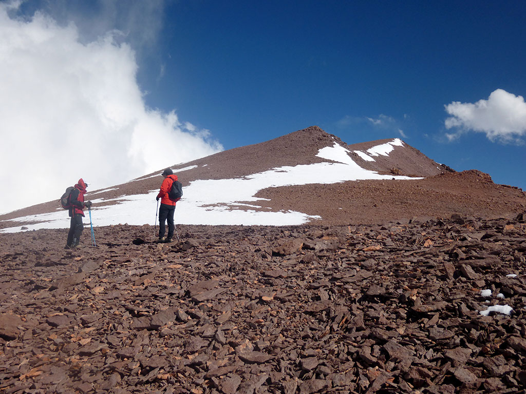 Una última parada nos dejó debajo de la pirámide cumbrera y salimos de los dominios glaciares. Por acarreo cubierto en parte con nieve nos montamos en un corto filo, pero de rocas grandes y con nieve fresca, lo cual hacía que en momentos nos hundiéramos hasta las rodillas. Superado este corto tramo, vimos franco los últimos metros a recorrer. Estábamos sobre los 6200 metros y el fin del trayecto era inminente.