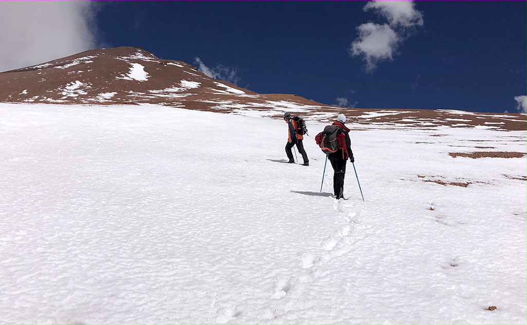 Luego de la primera noche y un pollo a la parrilla, nos dispusimos a seguir recorriendo la zona. Pensamos en llegar al paso y desde ahí intentar algún ascenso. Hace unos años, llegados a ese punto, nos decidimos por un ascenso al Nevado Mondaca (5.220 m), donde al llegar a la cumbre, descubrimos el testimonio del primer ascenso, realizado por Parys Liesicki en 2003.
