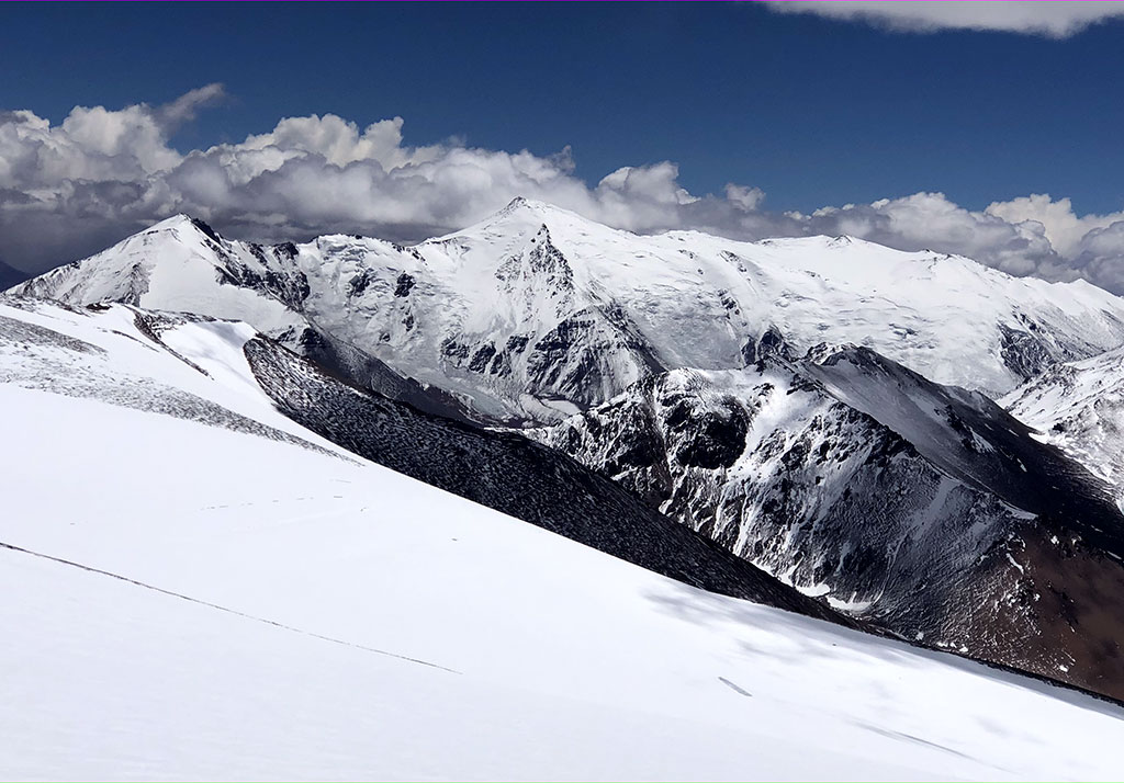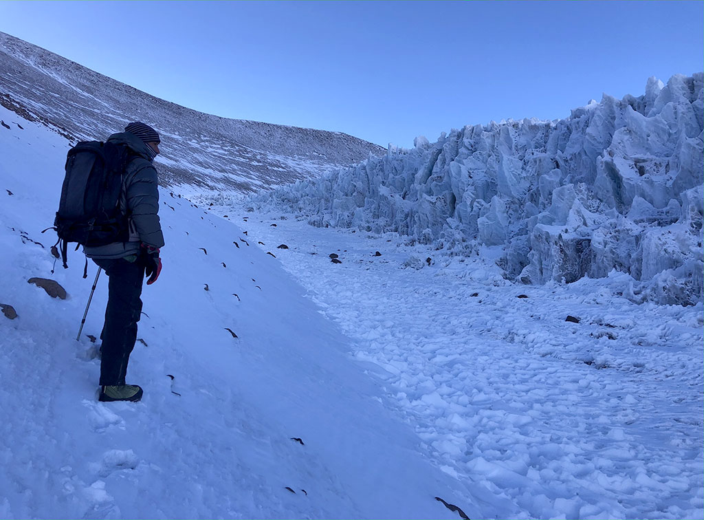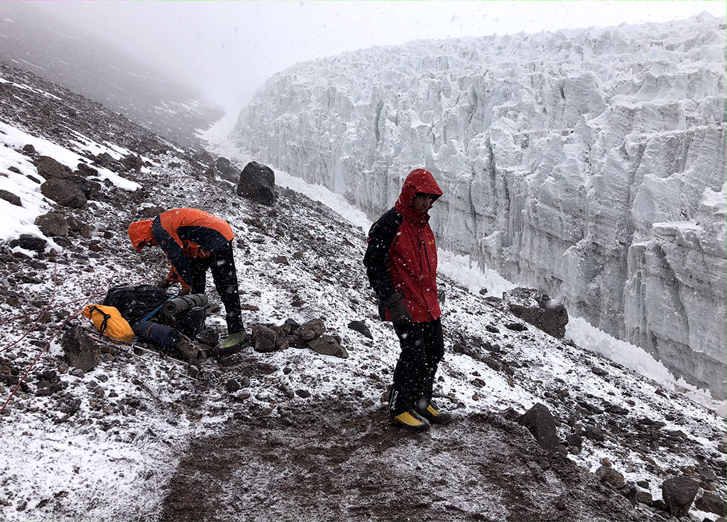 El ascenso continuó siguiendo la dirección del glaciar y en medio de una escenografía majestuosa, hielo, cielo azul profundo, nubes negras en el horizonte y amplias laderas nevadas.