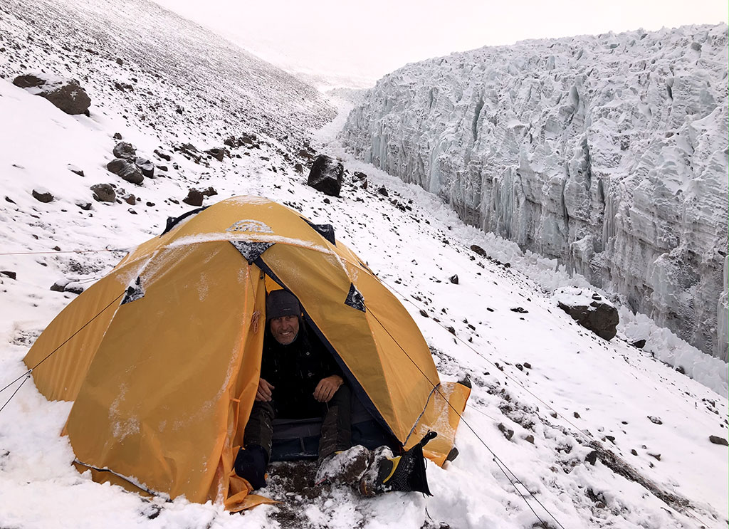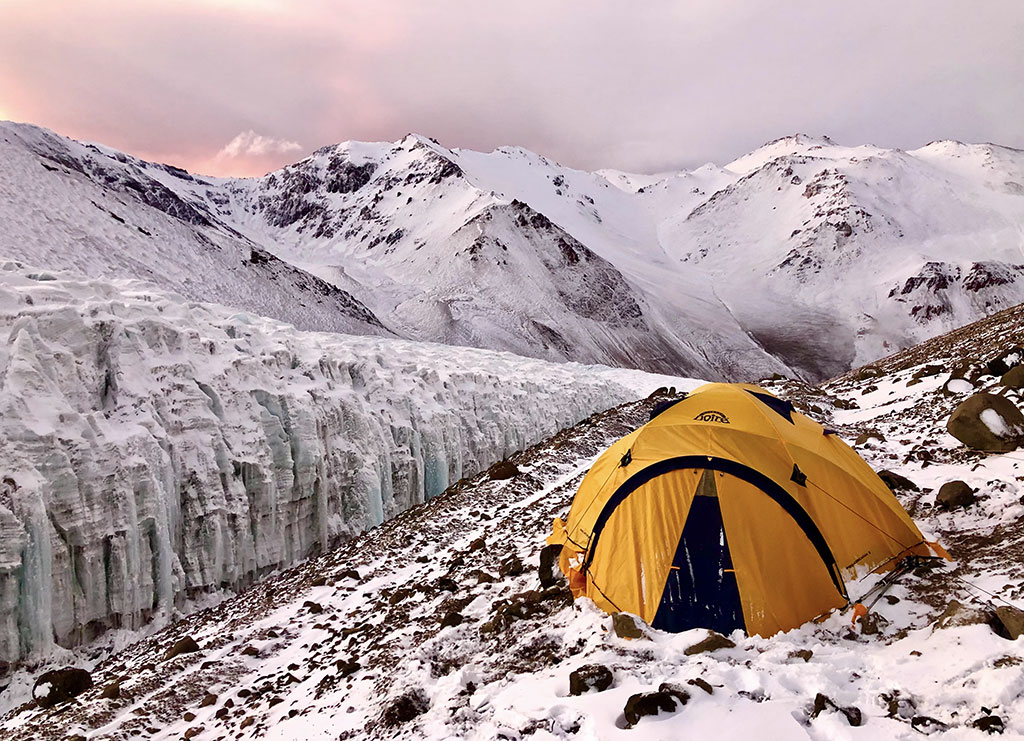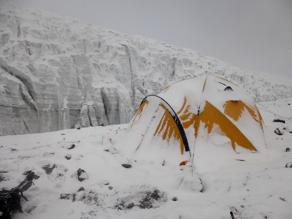 Bordeando el glaciar con sus altos flancos agrietados y bajo ya una intensa nevada, logramos acondicionar un espacio para instalar la carpa sobre los 5.300 m (30°22'52.60"S / 69°47'2.60"O) La nieve se iba acumulando y cenamos especulando cómo amanecería mañana.
