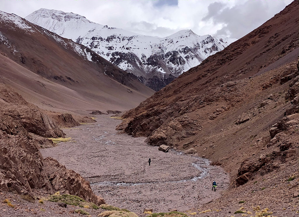 Amaneció y seguía lloviendo, los charcos de agua transformaban un paisaje que hasta ayer estaba absolutamente seco. Pasaban las horas y en alguna medida la ansiedad nos ganaba. Pasado el mediodía, pese al clima inestable partimos hacia la Quebrada del arroyo San Javier o de la Pirca, de acuerdo a la cartografía oficial argentina (30°19 '30.0"S / 69°44' 50.9"O, 3.850 m). Allí dejamos nuestro vehículo y comenzamos a caminar. El cielo oscuro le daba un marco llamativo a las fotos y los escasos rayos de luz que se colaban por las nubes, iluminaban un paisaje colorido, con verdes contrastando con los ocres de las rocas y el blanco del hielo. Avanzamos a buen paso siguiendo el arroyo y en algo más de un par de horas, en un recodo del río (30°21'18.80"S / 69°47'10.80"O, 4.375 m) torcimos el rumbo hacia el suroeste buscando una amplia quebrada por donde discurre un afluente del arroyo San Javier. Continuamos hasta un pircado (30°21'27.60"S / 69°47'21.70"O, 4.450 m) donde descansamos y comimos algo, para continuar hasta nuestro campo 1 (30°21'47.50"S / 69°47'14.80"O, 4.630 m), luego de superar escarpado acarreo para cambiar de quebrada. Pasamos una noche tranquila y la nevada anunciada nunca llegó.