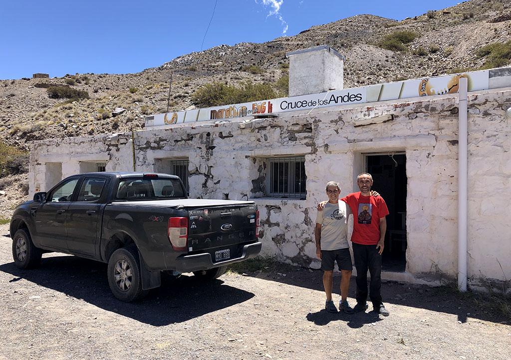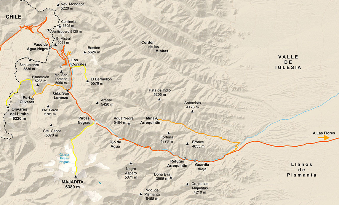 De San Juan viajamos a Las Flores, sellamos el permiso y continuamos hasta Guardia Vieja, sede del grupo de Gendarmería. Dos km más adelante llegamos al refugio (30°23 '22.6"S / 69°35' 19.1"O, 3.000 m).
